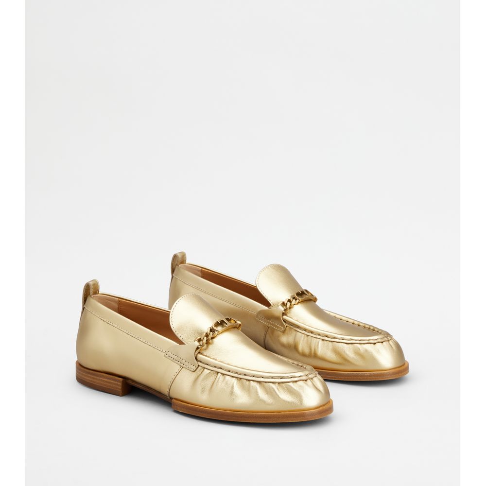 Лоферы из тонкой металлизированной кожи со слегка присборенным носком и металлической цепочкой в ​​виде буквы T. Элегантная и универсальная модель с кожаной подошвой с прострочкой и каблуком в форме подковы.