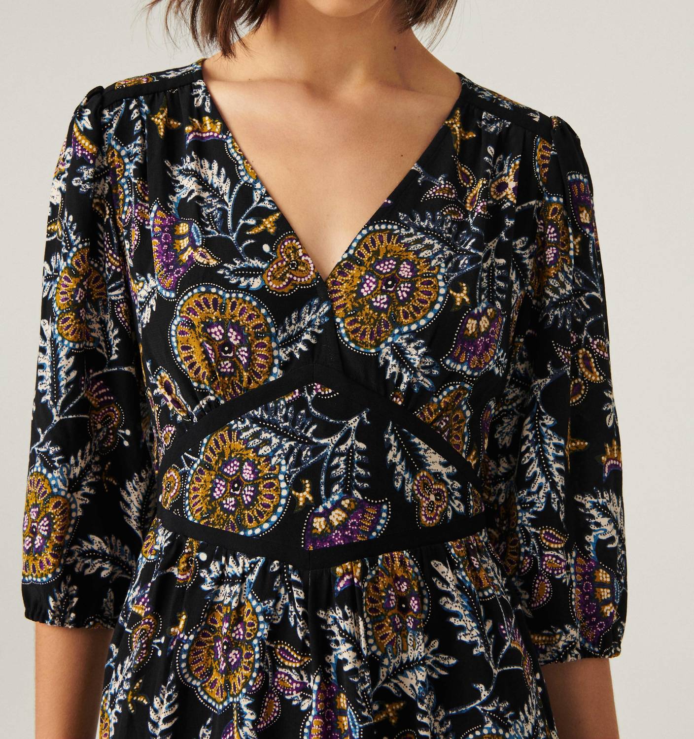 Просто добавьте шлепанцы или мюли, и все готово. Рукава длиной 3/4 с эластичными краями и V-образный вырез для женственного образа. Яркий принт, ромбовидные вырезы на талии. Размер в размер. Ручная стирка.