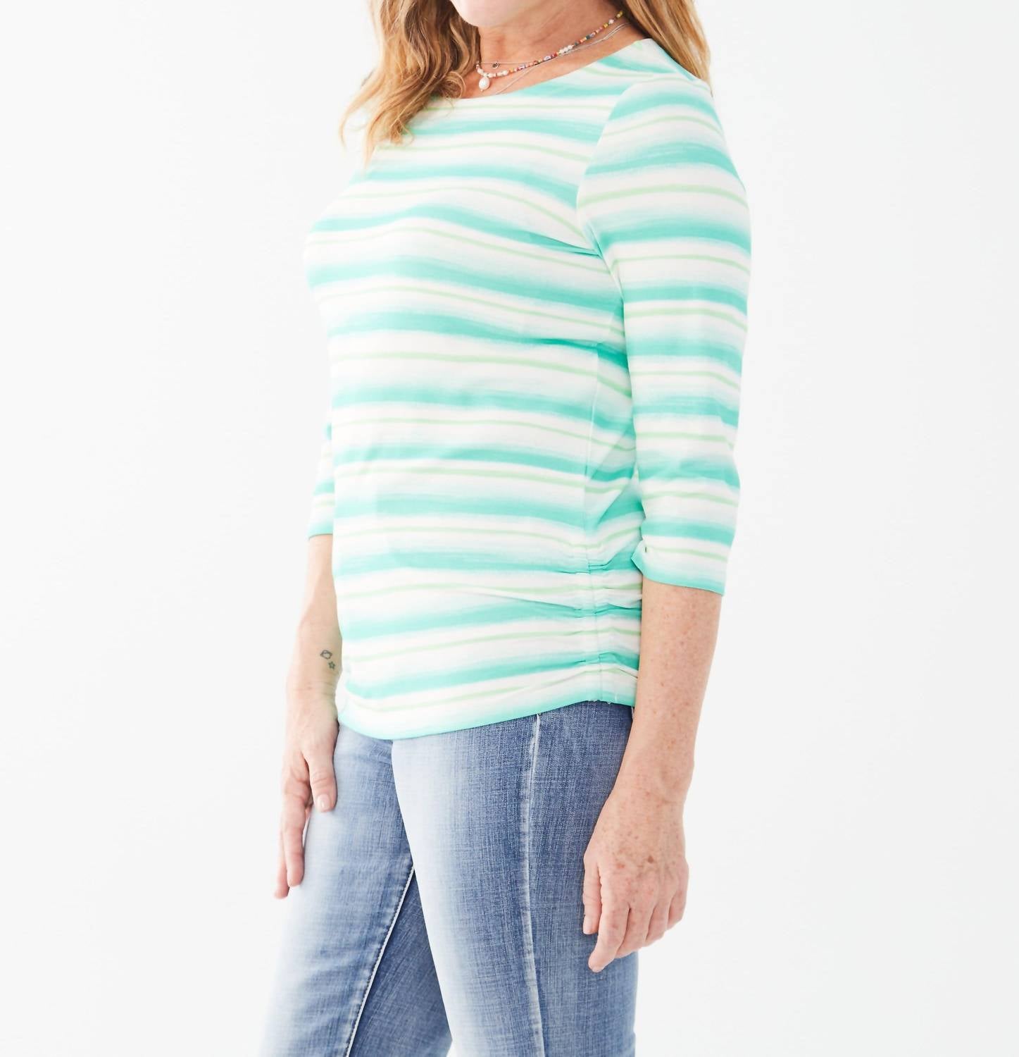 Идеальная посадка, милый дизайн, мягкая ткань. Вам понравится все в этой футболке с длинными рукавами. Топ с рукавами 3/4, полосками, вырезом-лодочкой и рюшами по бокам. Состав: 95% вискоза, 5% эластан.