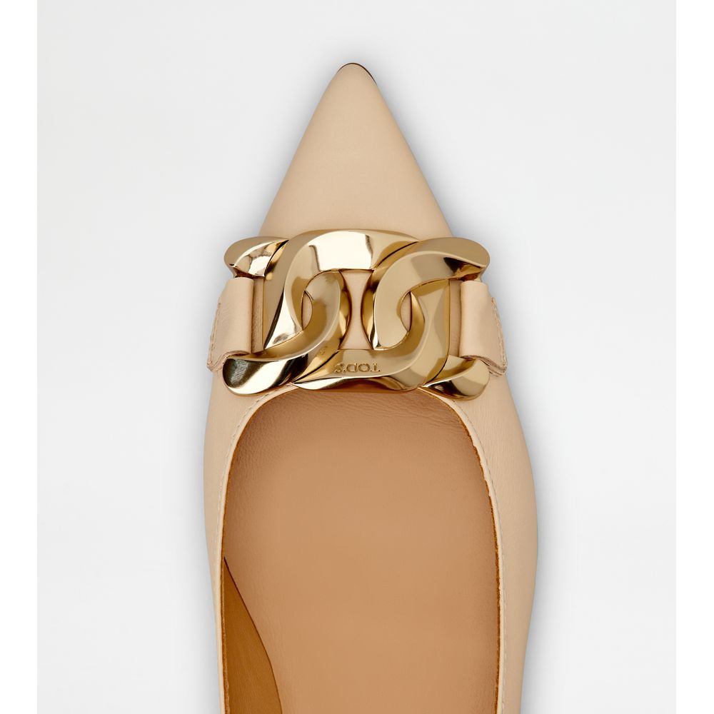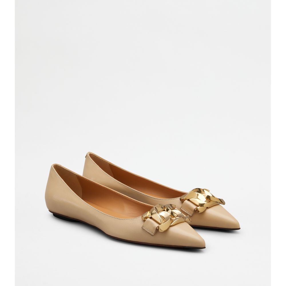 Элегантные балетки из гладкой кожи с зауженным носком и фирменной металлической цепочкой. Кожаная подошва, резиновые носок и пятка - это вневременная модель, сочетающая в себе женственность и комфорт.