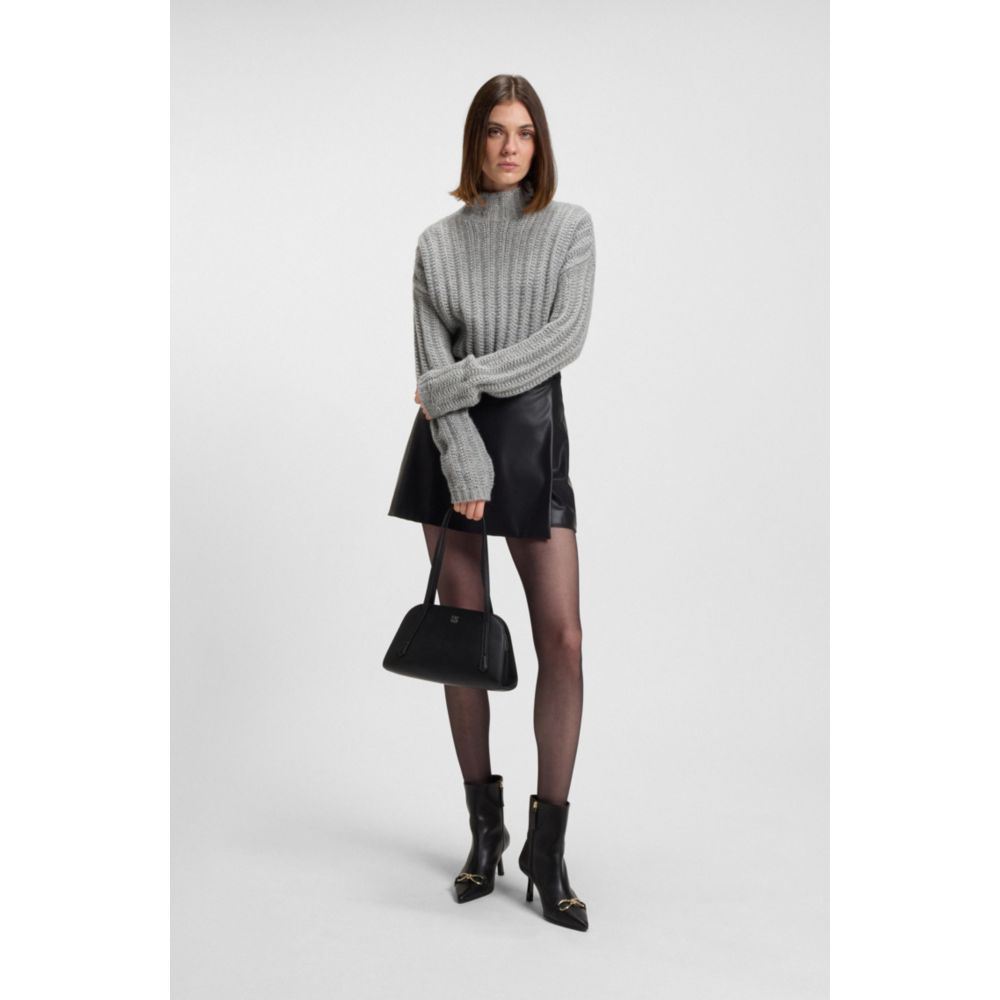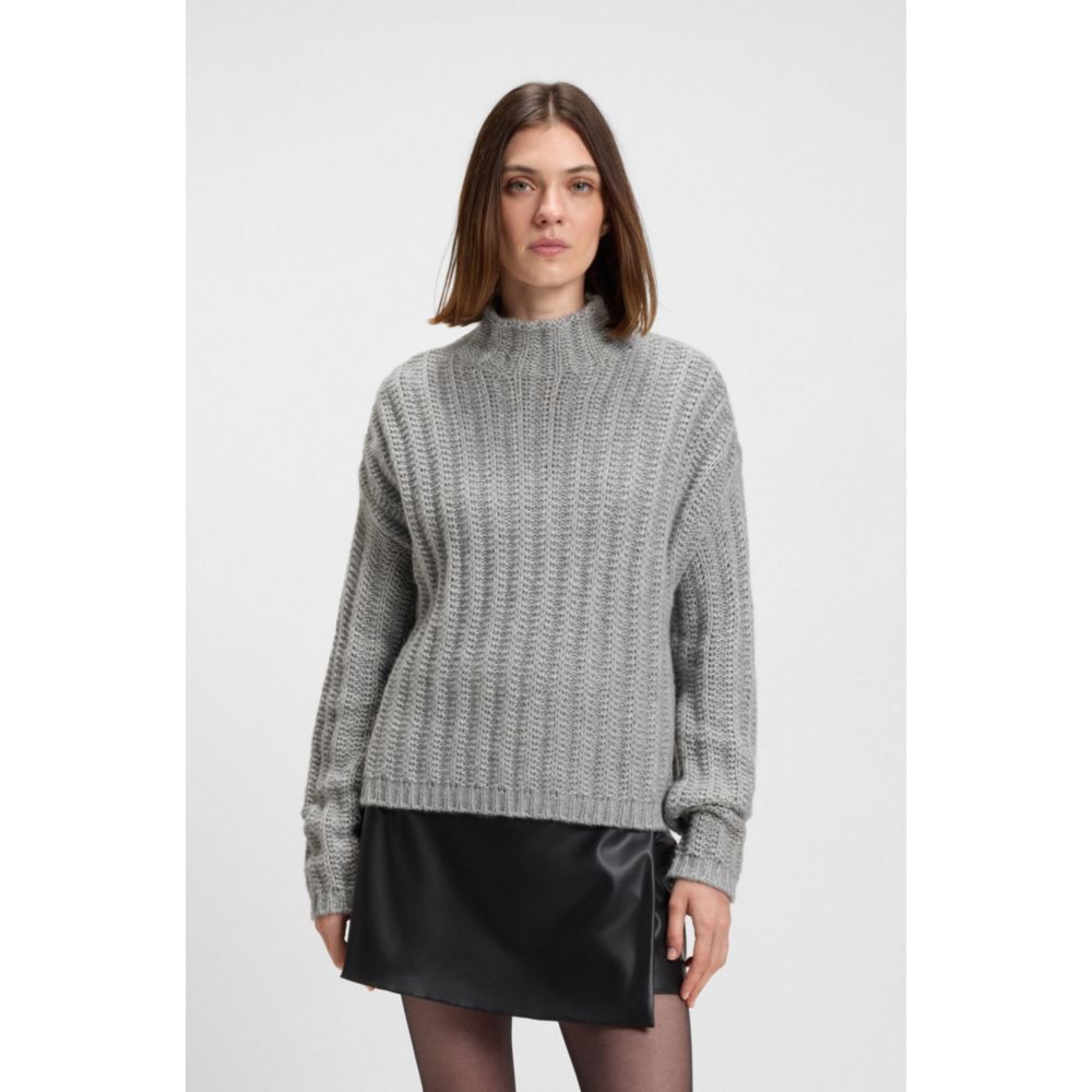 Этот свободный женский свитер HUGO, связанный объемной резинкой, отлично подходит для создания современных многослойных образов. В состав входят шерсть и альпака. Вышитый логотип. Воротник-стойка.