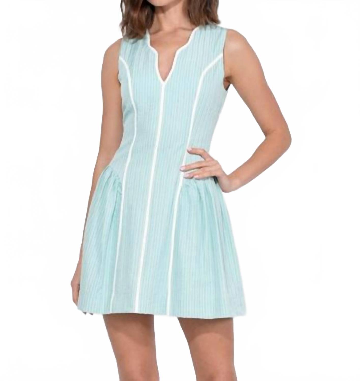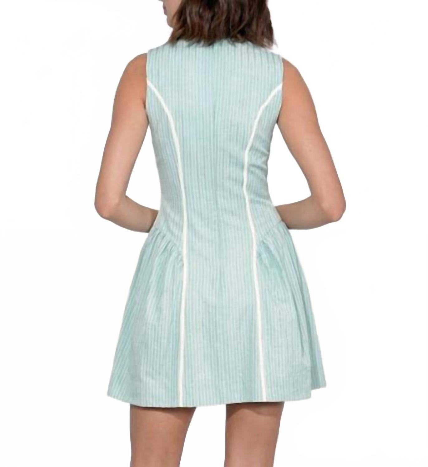 Короткое и воздушное платье для теплых дней. Это мини-платье без рукавов выполнено в полосатом цвете аквамарин. Модель имеет заниженную талию и волнистый вырез. Застегивается на молнию сзади.