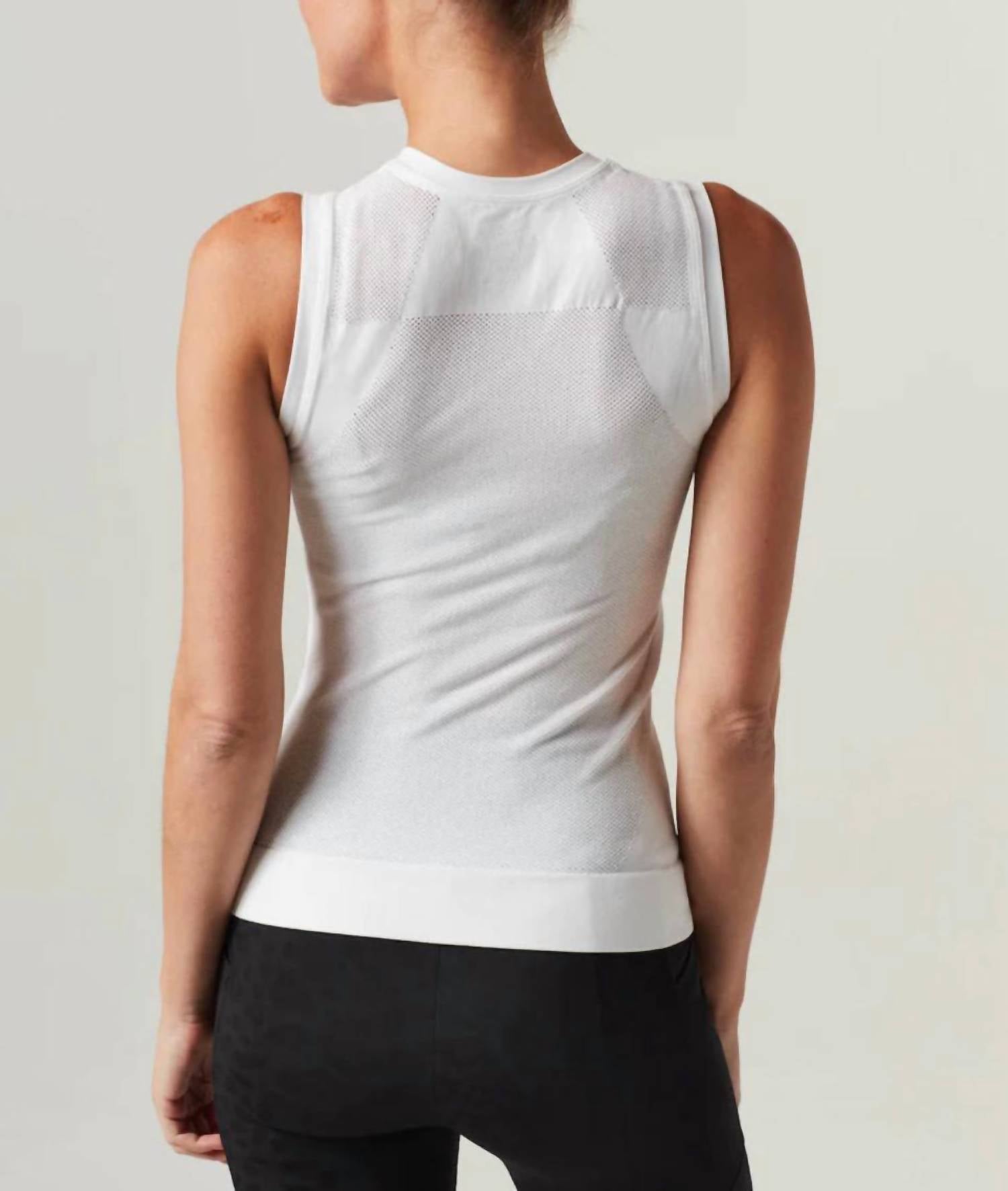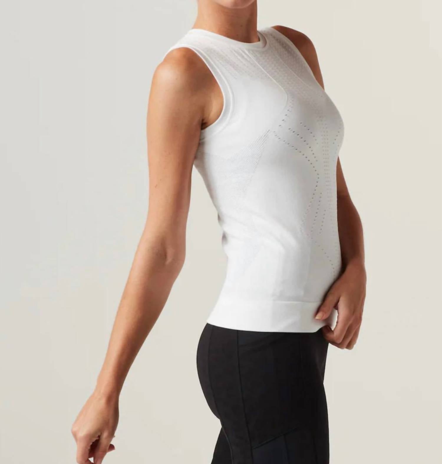 Бесшовная текстура, облегающая фигуру, с сетчатой вентиляцией. Состав: 82% вискоза, 13% полиамид, 5% эластан. На модели размер Small.