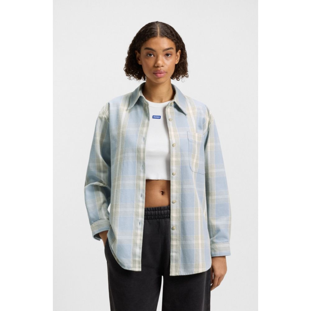 Добавьте изюминку в повседневные образы с этой женской блузкой HUGO в пастельную клетку. Свободный крой из мягкого хлопкового твила. Вышитый логотип Happy HUGO на накладном кармане.