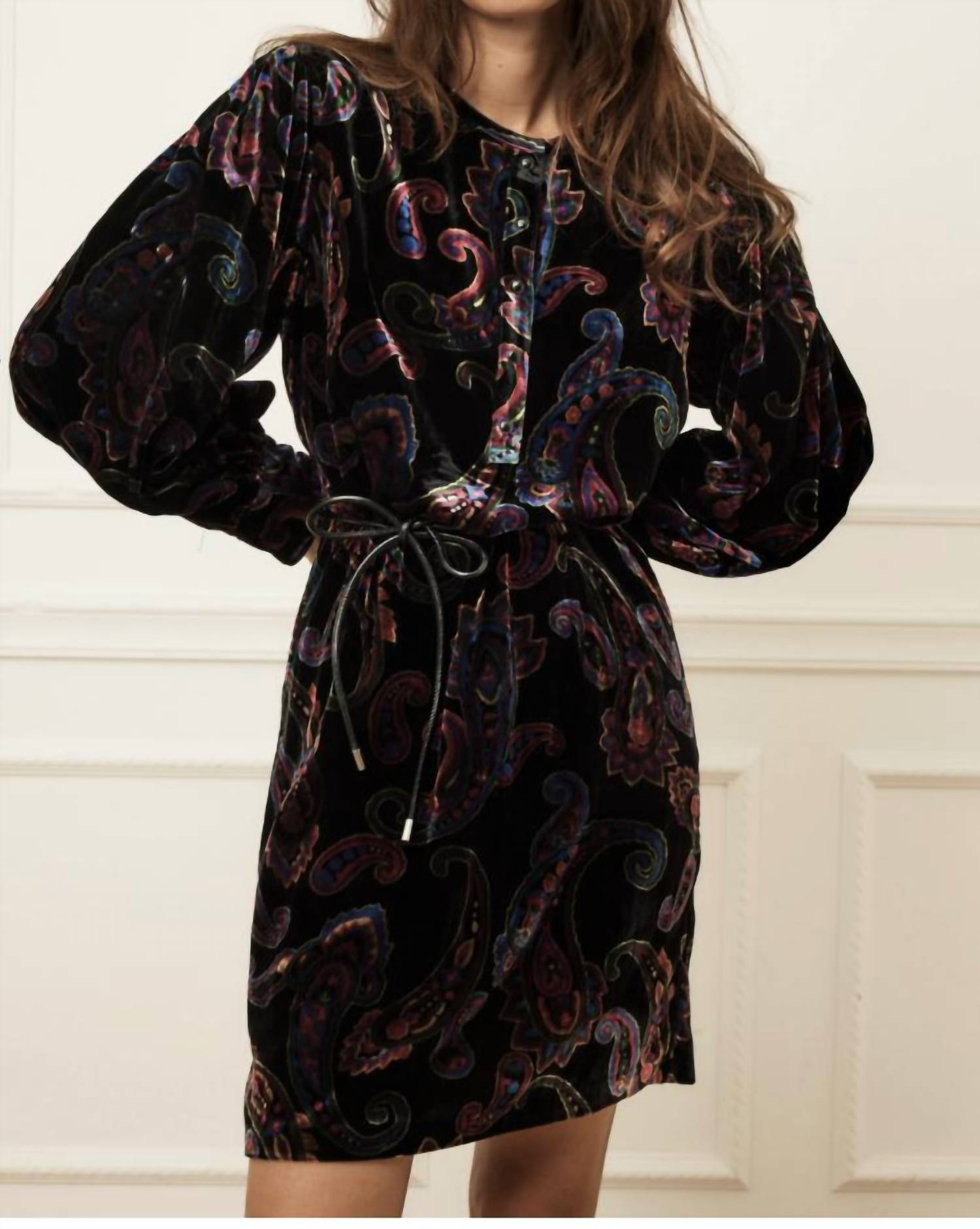 Платье, подчеркивающее фигуру и в то же время удобное, которое вы будете носить сезон за сезоном. Бархатистое платье с ярким узором пейсли. Кожаный пояс-накидка в комплекте.