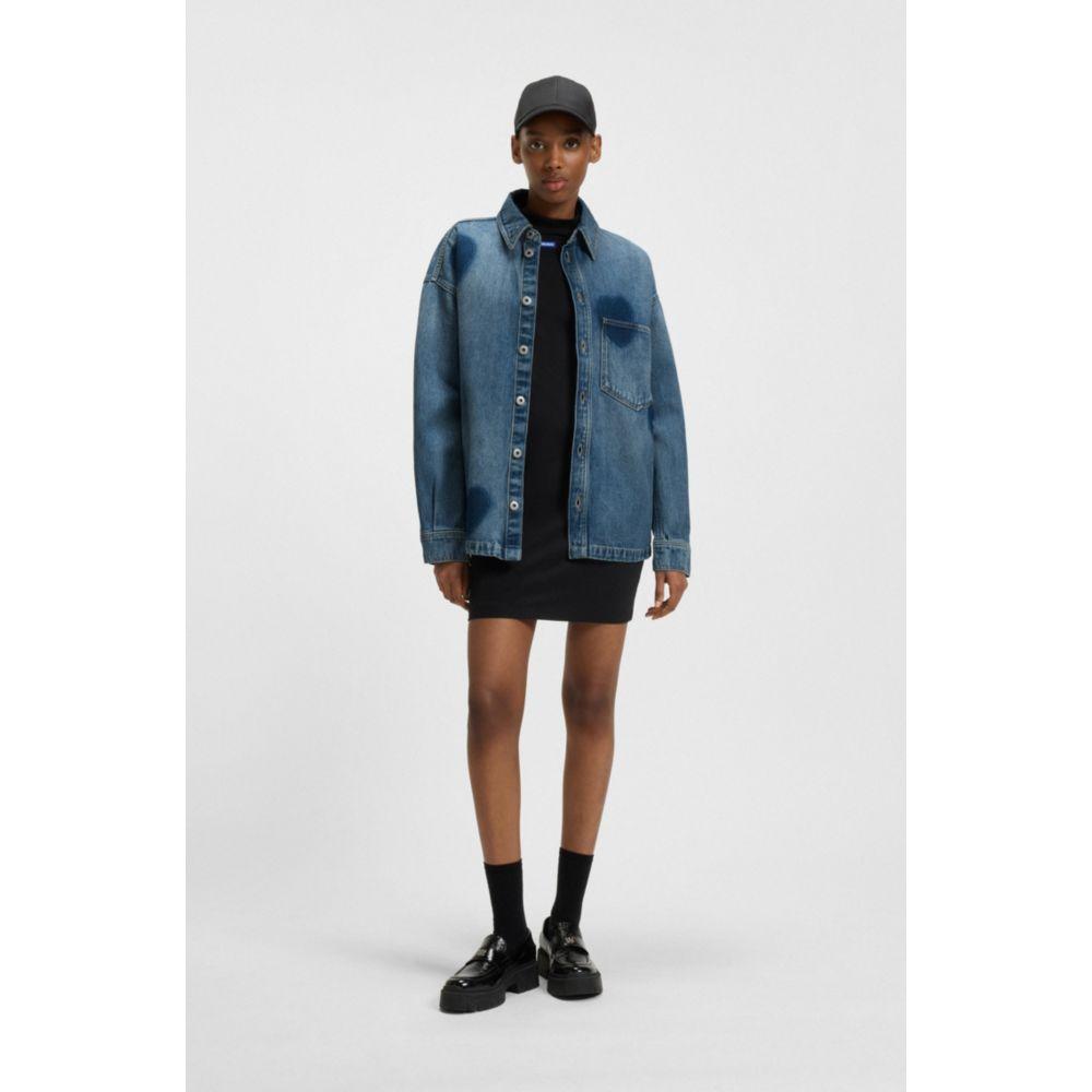 Эта женская рубашка HUGO с лазерной печатью сердец и логотипом Happy HUGO - современная классика. Изготовлена ​​из плотного денима с аутентичным синим оттенком.