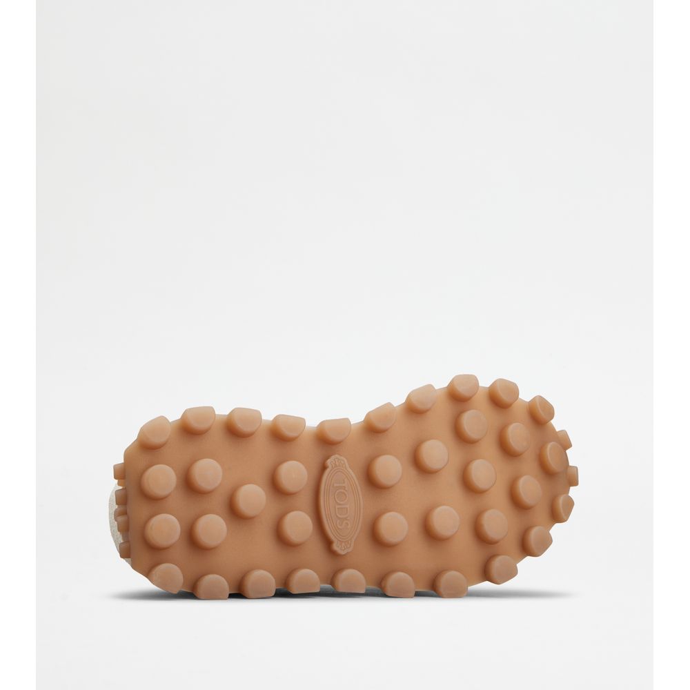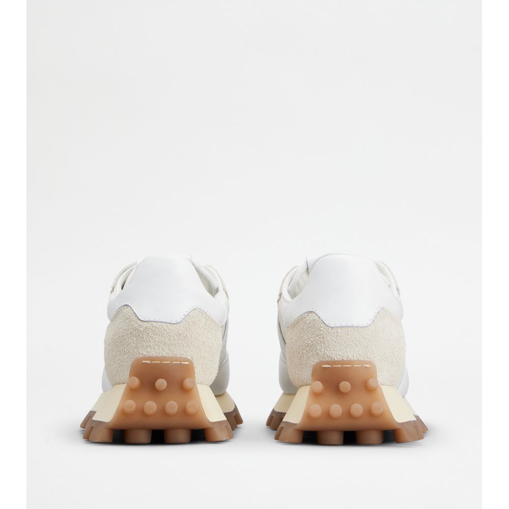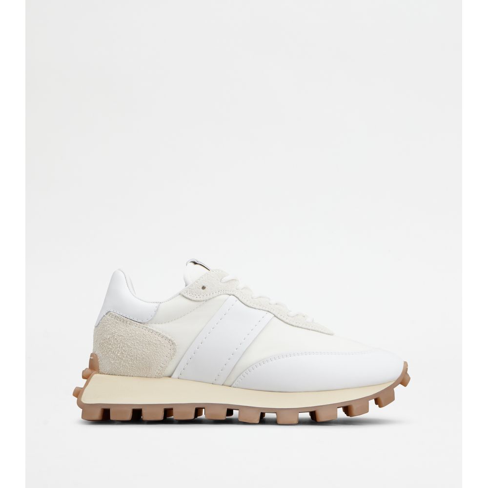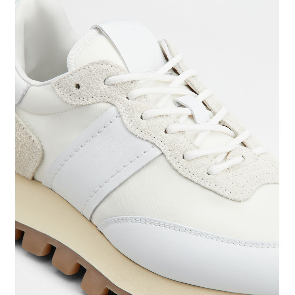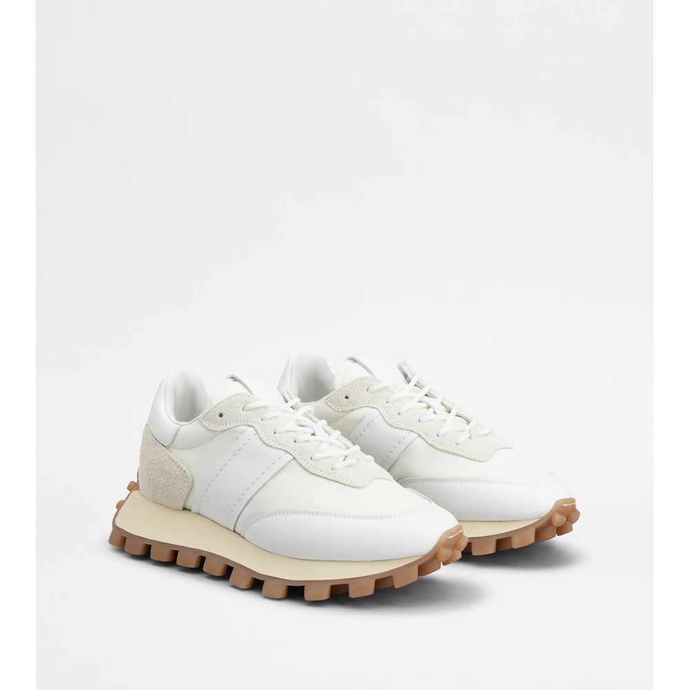 Кроссовки из гладкой кожи и замши с тканевыми вставками, вытисненной монограммой Tod's на язычке и резиновой подошвой с крупными резиновыми камешками.