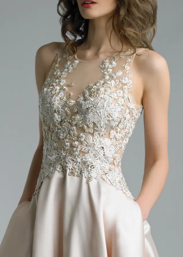 Вечернее платье с вышивкой бисером на груди, глубоким V-образным вырезом на спине и карманами на юбке. Модель # D8353L. Цвет шампанского. Размер XS (2).
