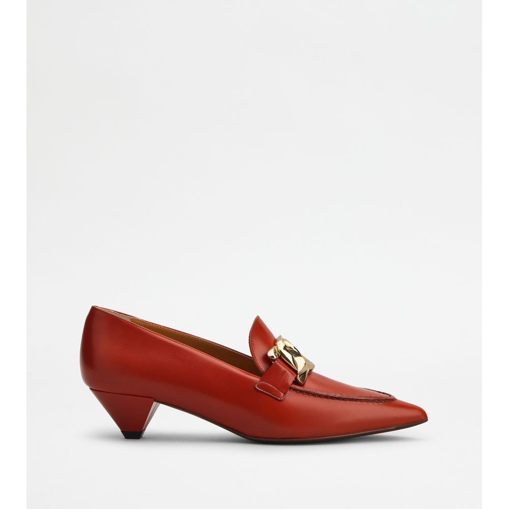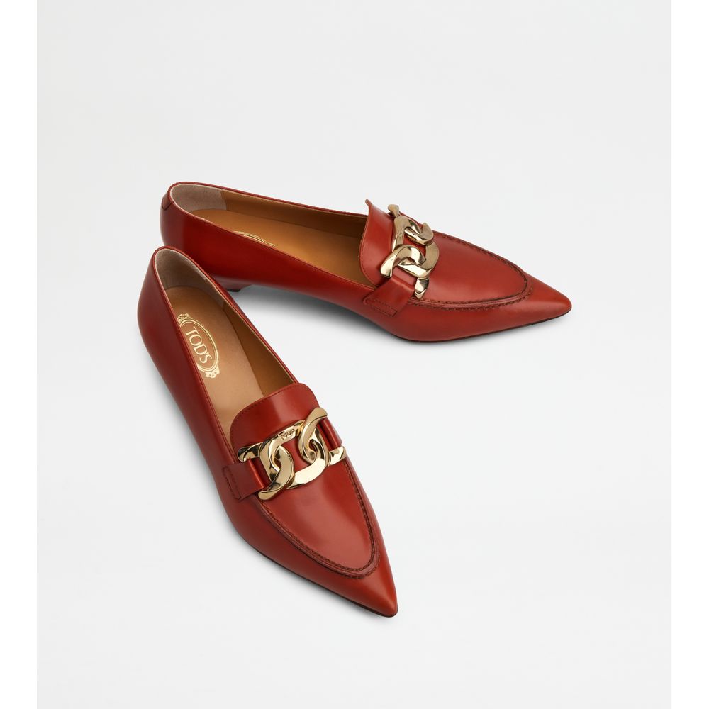 Лоферы с обтянутым коническим каблуком и сужающимся носком, изготовленные из изысканной кожи, с фирменной металлической цепочкой и кожаной подошвой.