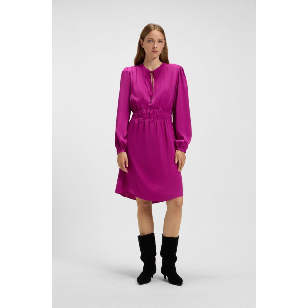 Это женское платье BOSS с элегантным силуэтом, присборенным по фигуре и эластичной талией. Завязка на вырезе-капельке. Изготовлено из жатого атласа.