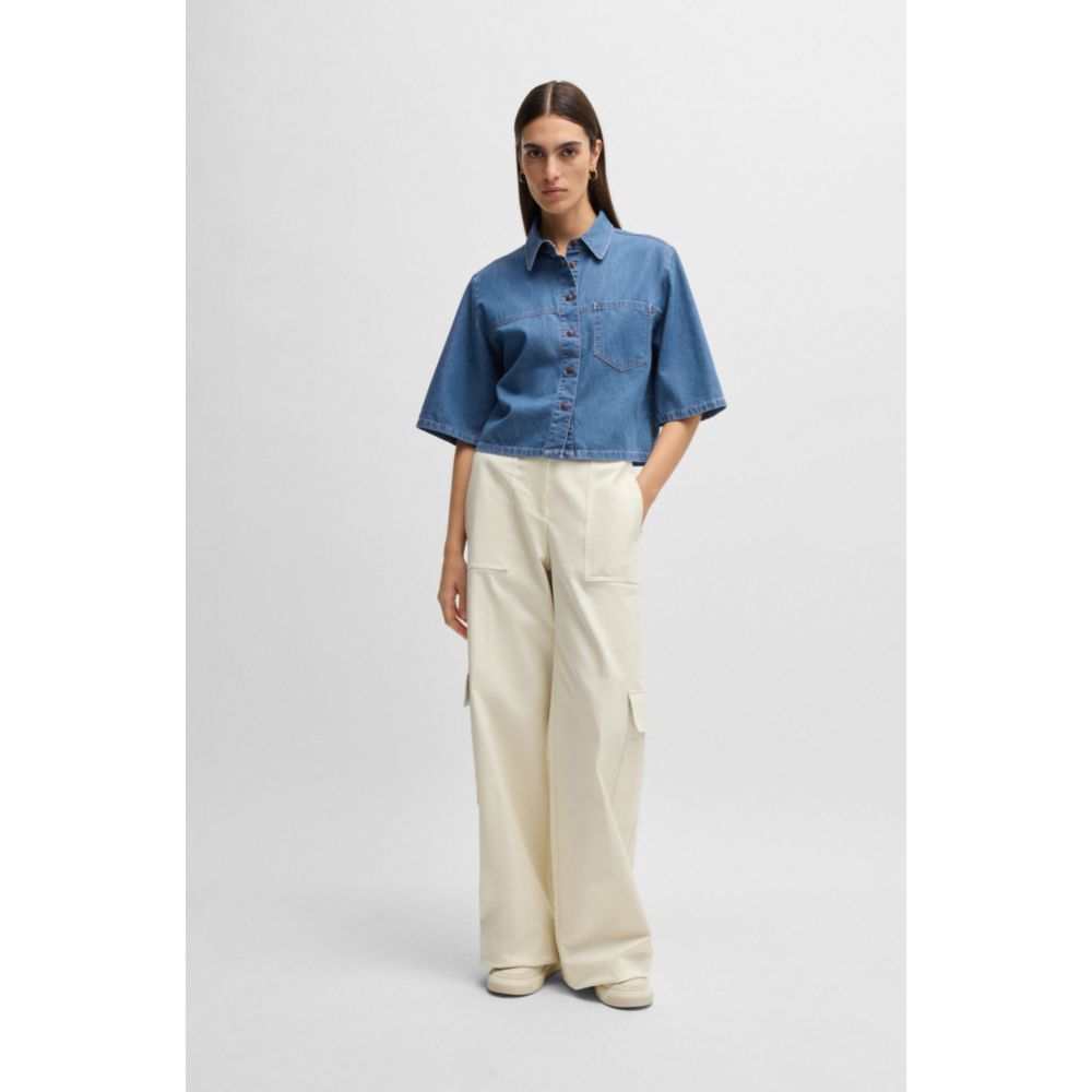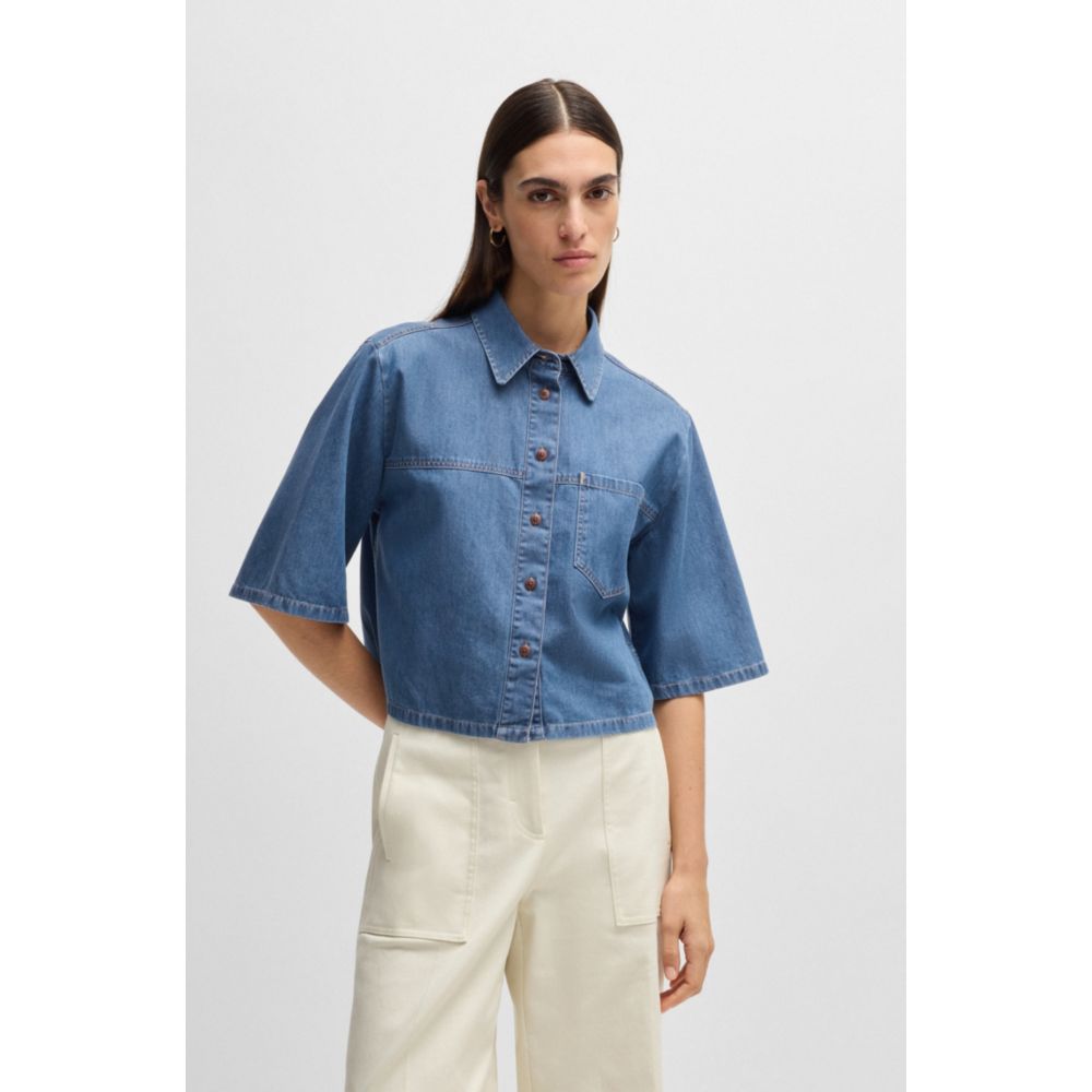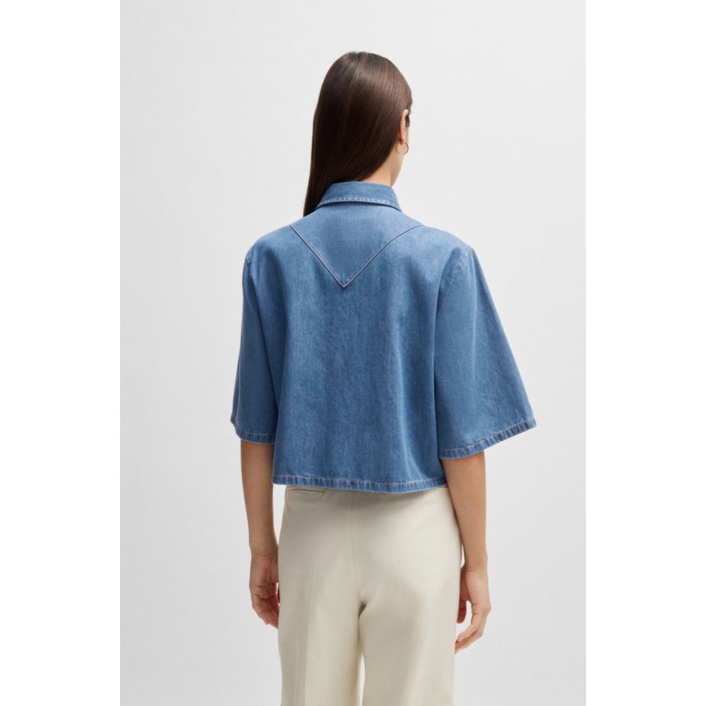 Эта женская блузка BOSS свободного кроя с укороченными рукавами - современный акцент. Джинсовая ткань с кромкой имеет аутентичный синий оттенок.