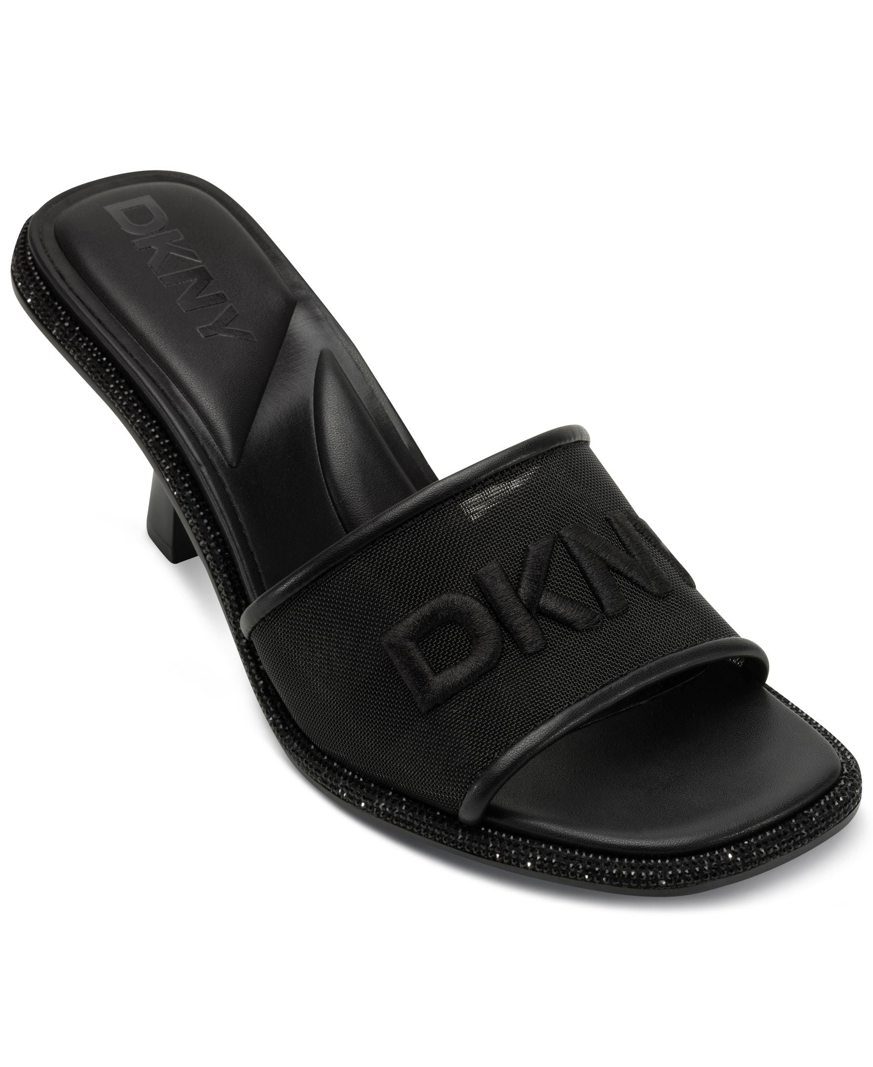 Босоножки DKNY Jileen, отделанные металликом на носках, сочетают в себе цепочную фурнитуру и каблуки-рюмочки, создавая элегантный образ.