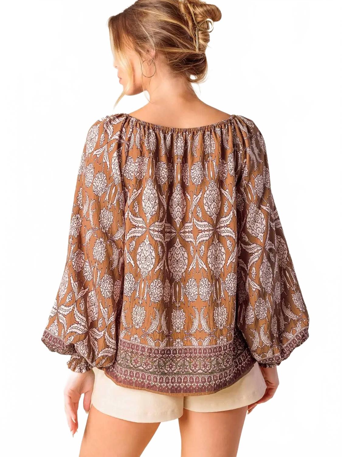 Блузка, которая никогда не выйдет из моды. Открытые плечи, принт в стиле бохо. Рукава-фонарики.