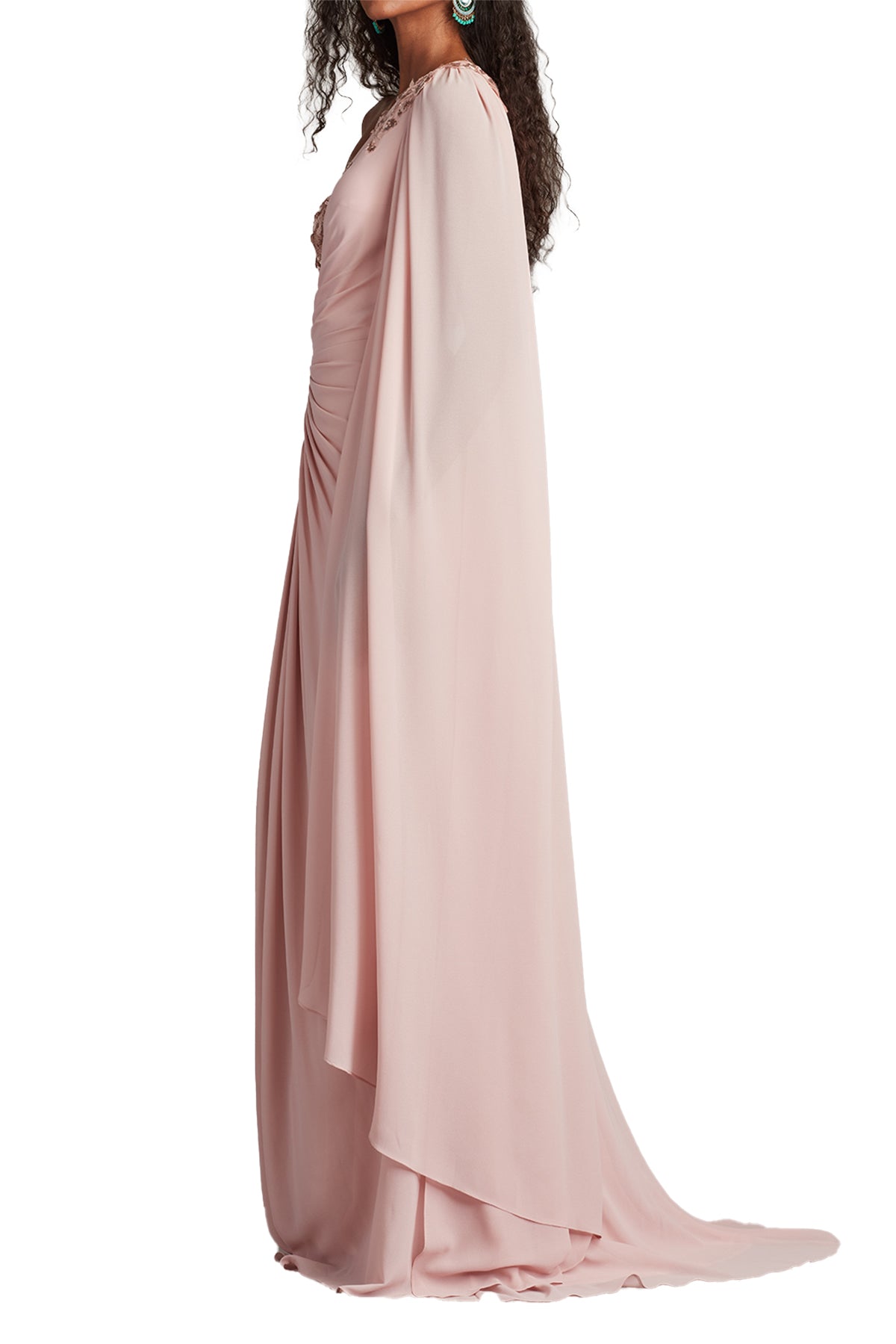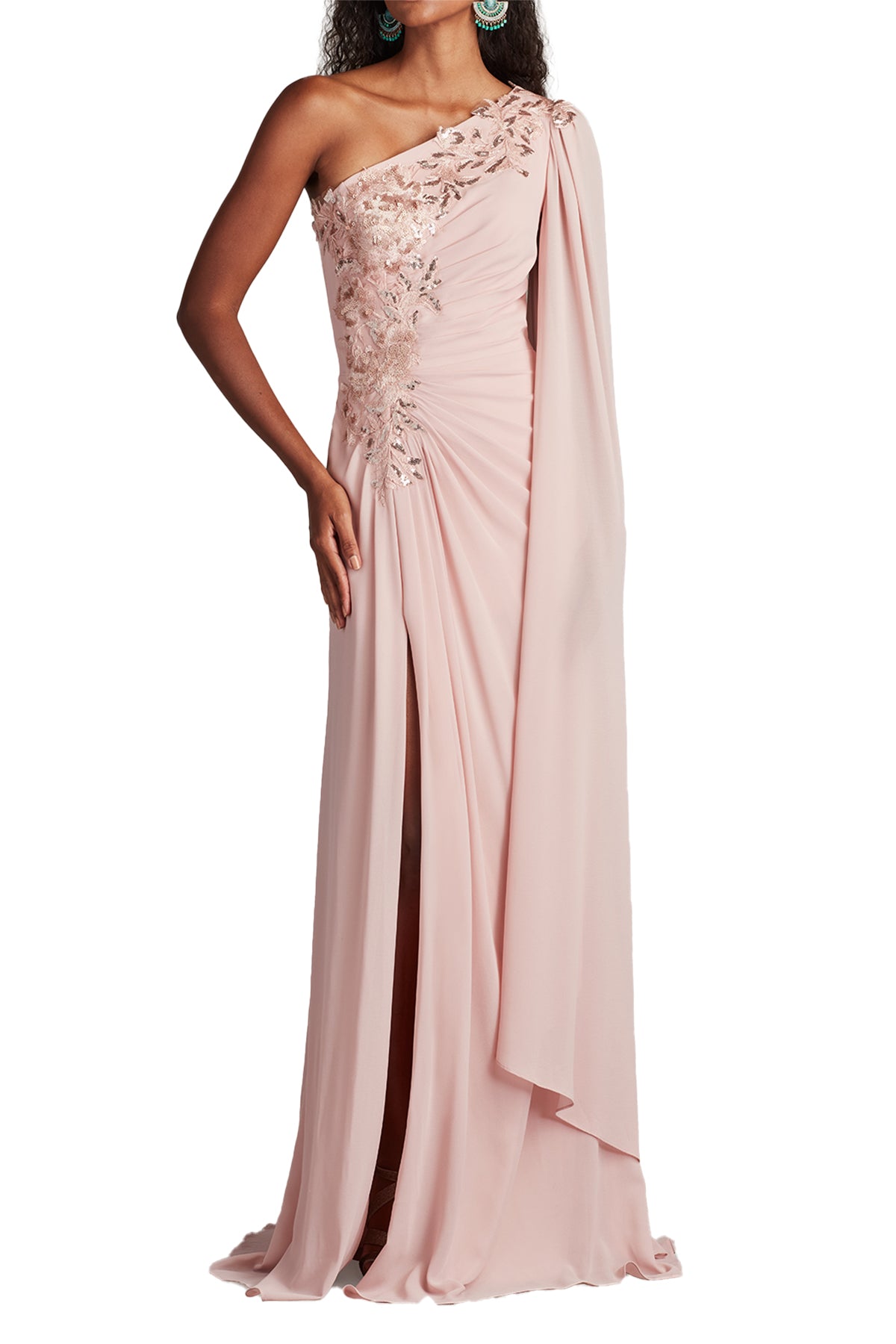 Излучайте элегантность в этом вечернем платье на одно плечо с струящимся рукавом-накидкой.
