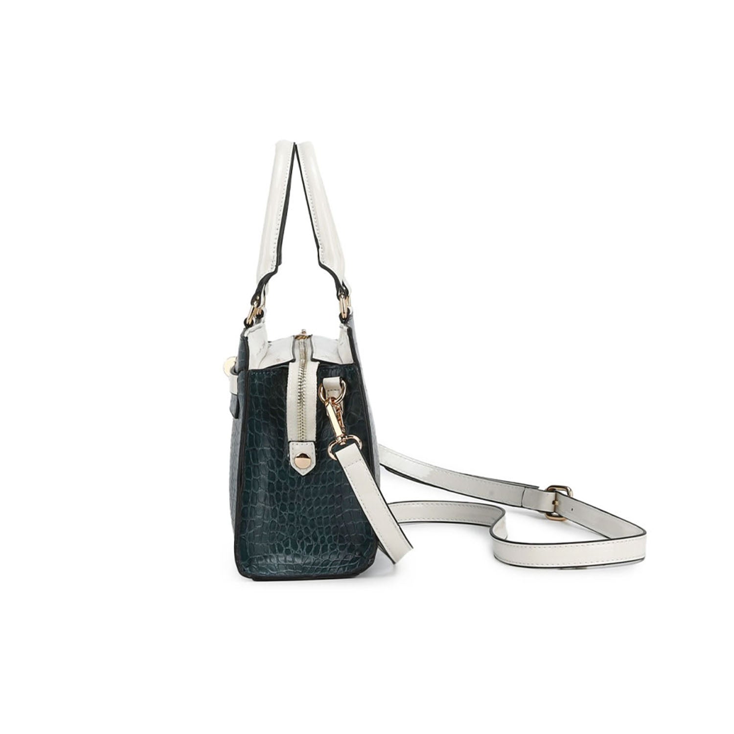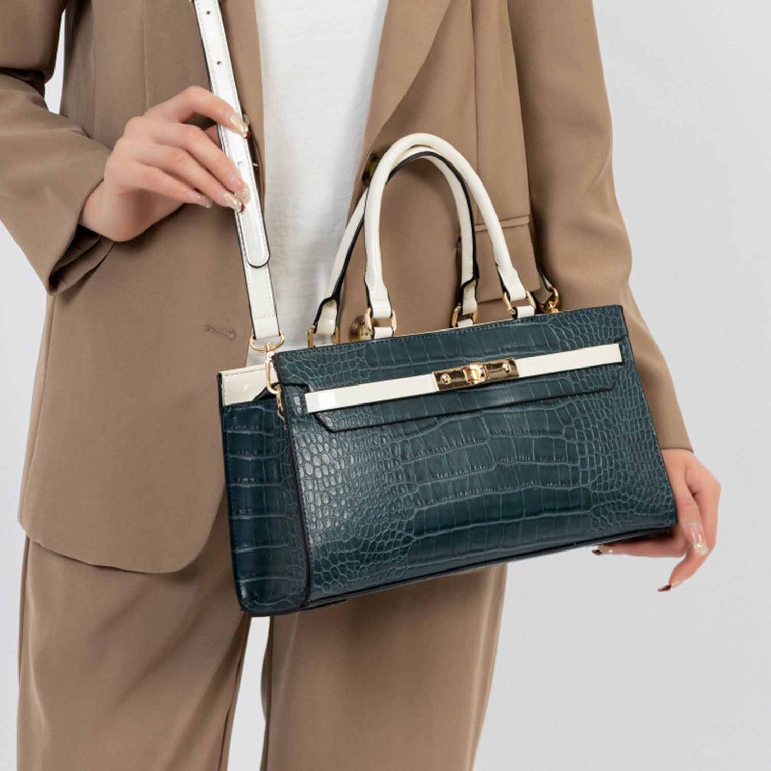 Эта стильная широкая сумка-сэтчел, изготовленная из высококачественной искусственной веганской кожи с тиснением под крокодила, дополнена контрастной виниловой отделкой и стильным передним ремнем с декоративной застежкой-поворотником, придающим ей роскошный вид. Универсальная сумка оснащена двойными ручками сверху и съемным регулируемым ремнем через плечо для различных вариантов ношения. Вместительное внутреннее пространство включает два накладных кармана и карман на молнии на стене, что позволяет хранить все необходимое организованно и в безопасности. Эта структурированная сумка-сэтчел идеально подходит для повседневного ношения и сочетает в себе элегантность и функциональность - незаменимый аксессуар для современной модницы.