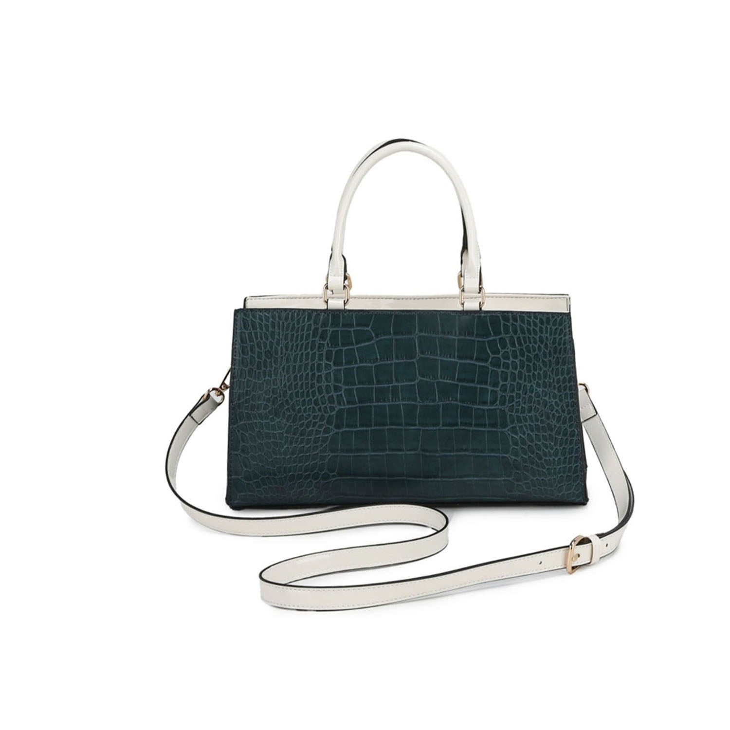 Эта стильная широкая сумка-сэтчел, изготовленная из высококачественной искусственной веганской кожи с тиснением под крокодила, дополнена контрастной виниловой отделкой и стильным передним ремнем с декоративной застежкой-поворотником, придающим ей роскошный вид. Универсальная сумка оснащена двойными ручками сверху и съемным регулируемым ремнем через плечо для различных вариантов ношения. Вместительное внутреннее пространство включает два накладных кармана и карман на молнии на стене, что позволяет хранить все необходимое организованно и в безопасности. Эта структурированная сумка-сэтчел идеально подходит для повседневного ношения и сочетает в себе элегантность и функциональность - незаменимый аксессуар для современной модницы.