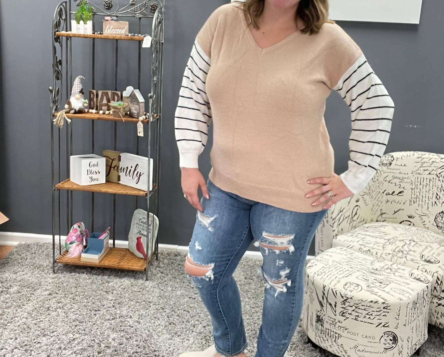Носите этот свитер с V-образным вырезом с любимыми джинсами для идеального осеннего образа. Откройте для себя свитер Nora от BLAKELEY - стильный и удобный выбор в приятном бежевом оттенке с контрастными черно-белыми полосками на рукавах. Этот свитер с V-образным вырезом и длинными рукавами изготовлен из идеально эластичной смеси 45% акрила, 30% нейлона и 25% полиэстера, что обеспечивает комфорт и стиль. Благодаря застежке-липучке, он подходит для размеров от S/M до 2X, что делает его универсальным дополнением к любому гардеробу. Ощутите непринужденный стиль в этом свитере с узором, идеально подходящем для любой повседневной прогулки.