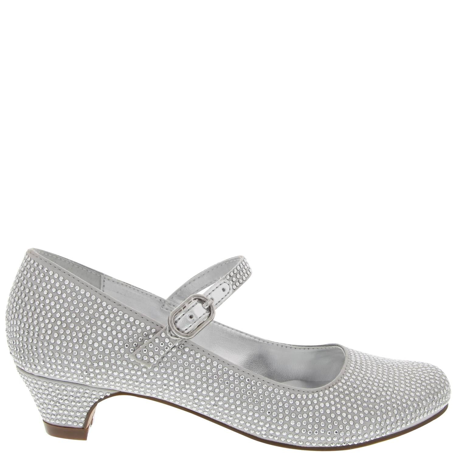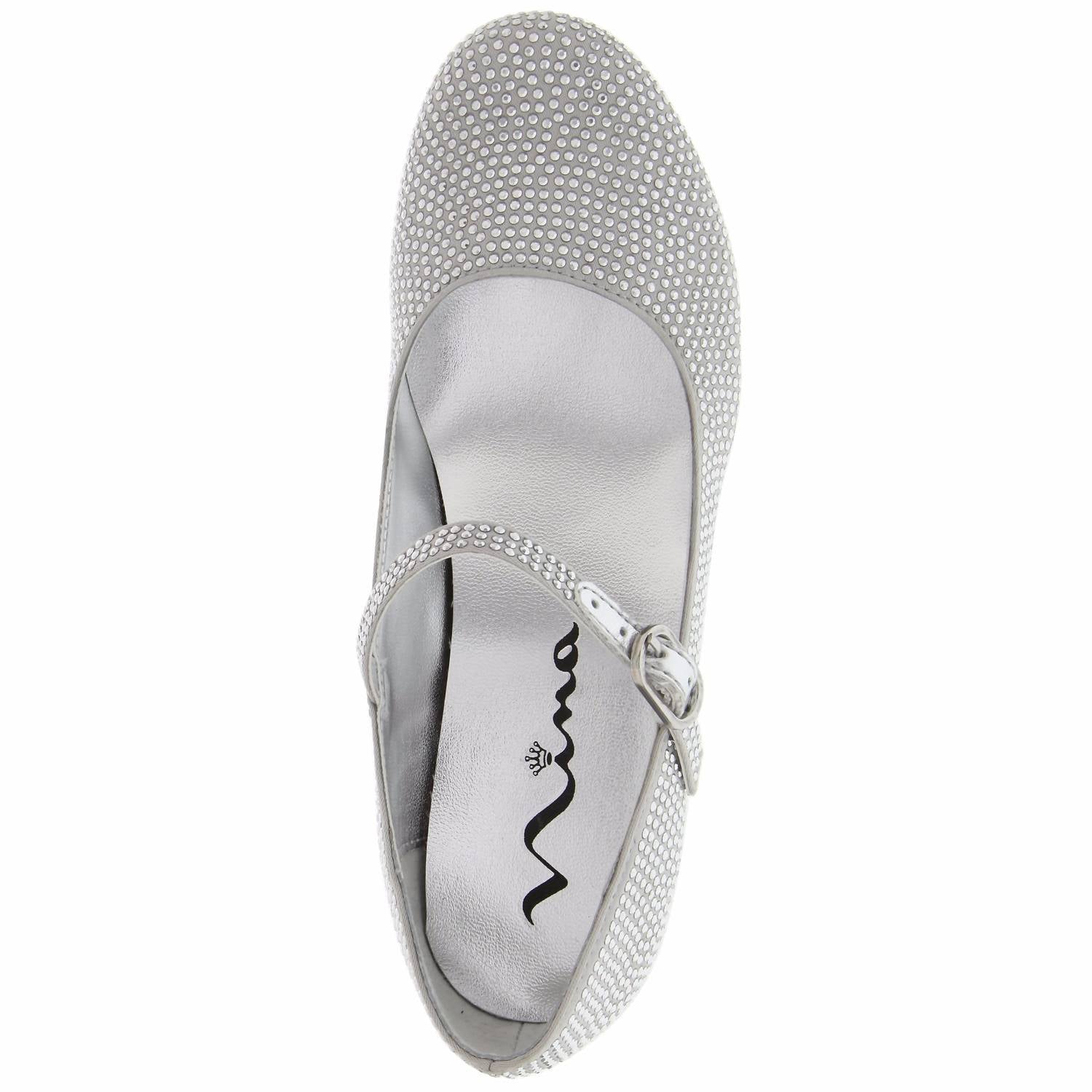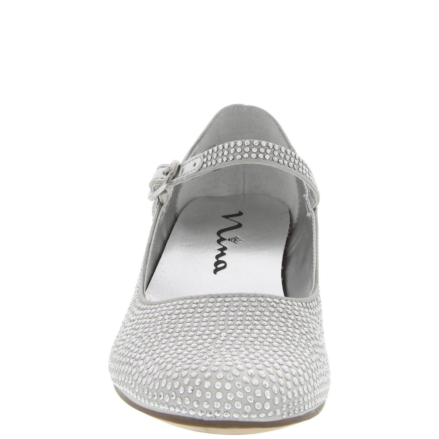 Introducing the Kid's Zelia Shoes by Nina, a stylish choice for any young fashionista. These girl's dress shoes in a dazzling silver color are crafted from luxurious satin. Designed with a comfortable 1.25-inch block heel, they offer both elegance and practicality for big kids. Featuring a medium shoe width and a classic round toe shape, these shoes promise a perfect fit for every occasion.