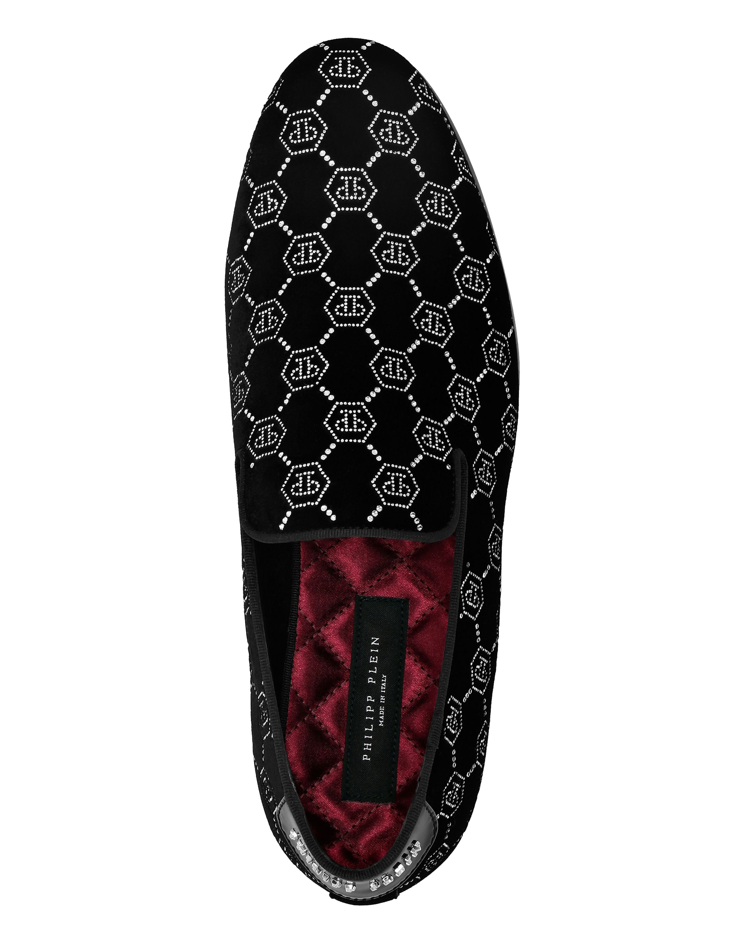 Вечерние лоферы - незаменимый предмет гардероба для создания элегантного образа. Откройте для себя обновленную версию слипонов от Plein. Посмотрите, как детали играют важную роль. ● Монограмма со стразами на бархатном верхе ● Отделка Grosgrain ● Лакированная накладка на пятке с металлической надписью ● Заклепка «Череп и кости» на пятке ● Подошва из натуральной кожи ● Логотип, нанесенный методом горячего тиснения на подошву ● Подкладка из наппы ● Стелька из стеганого атласа с ромбовидным узором