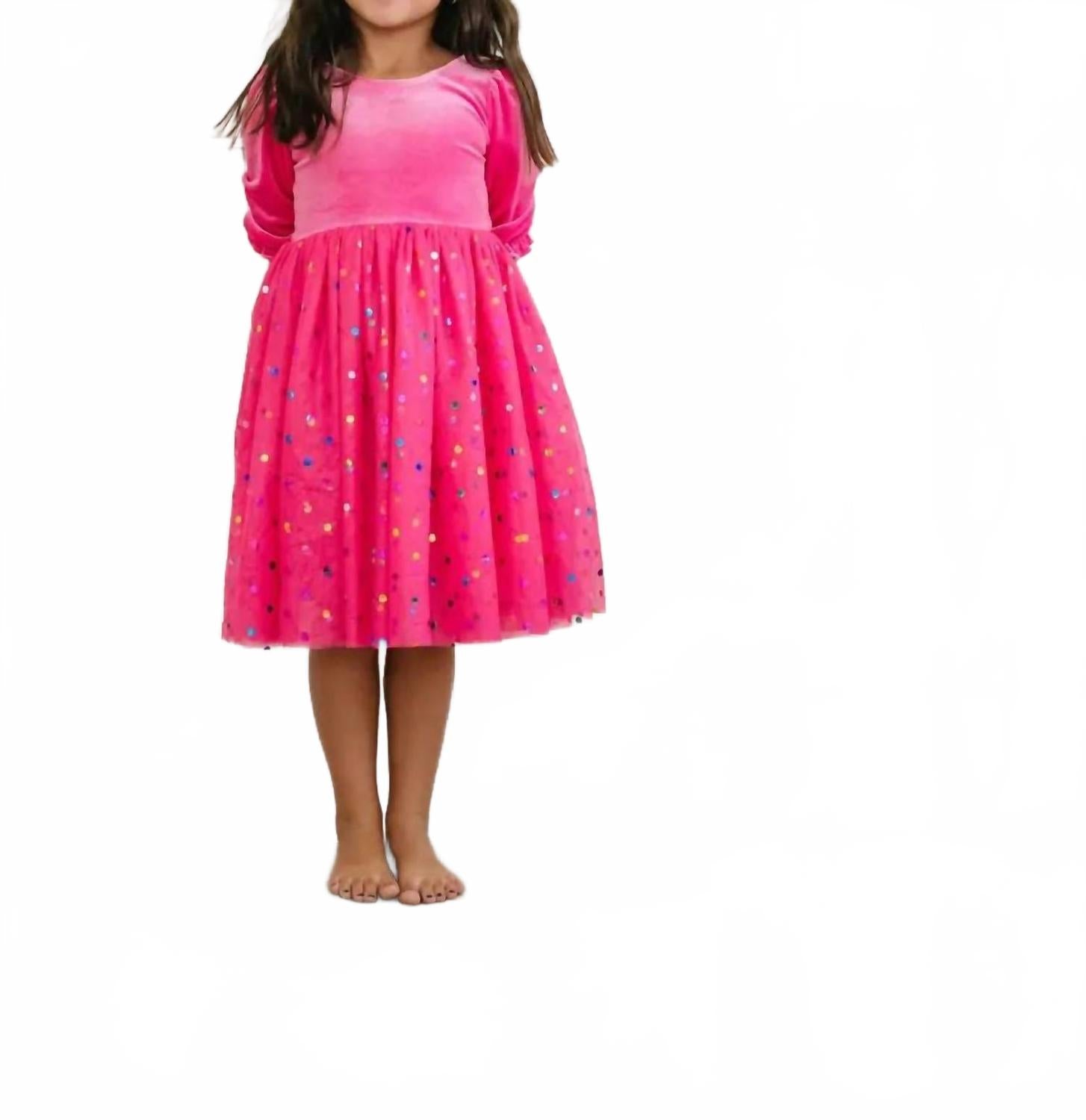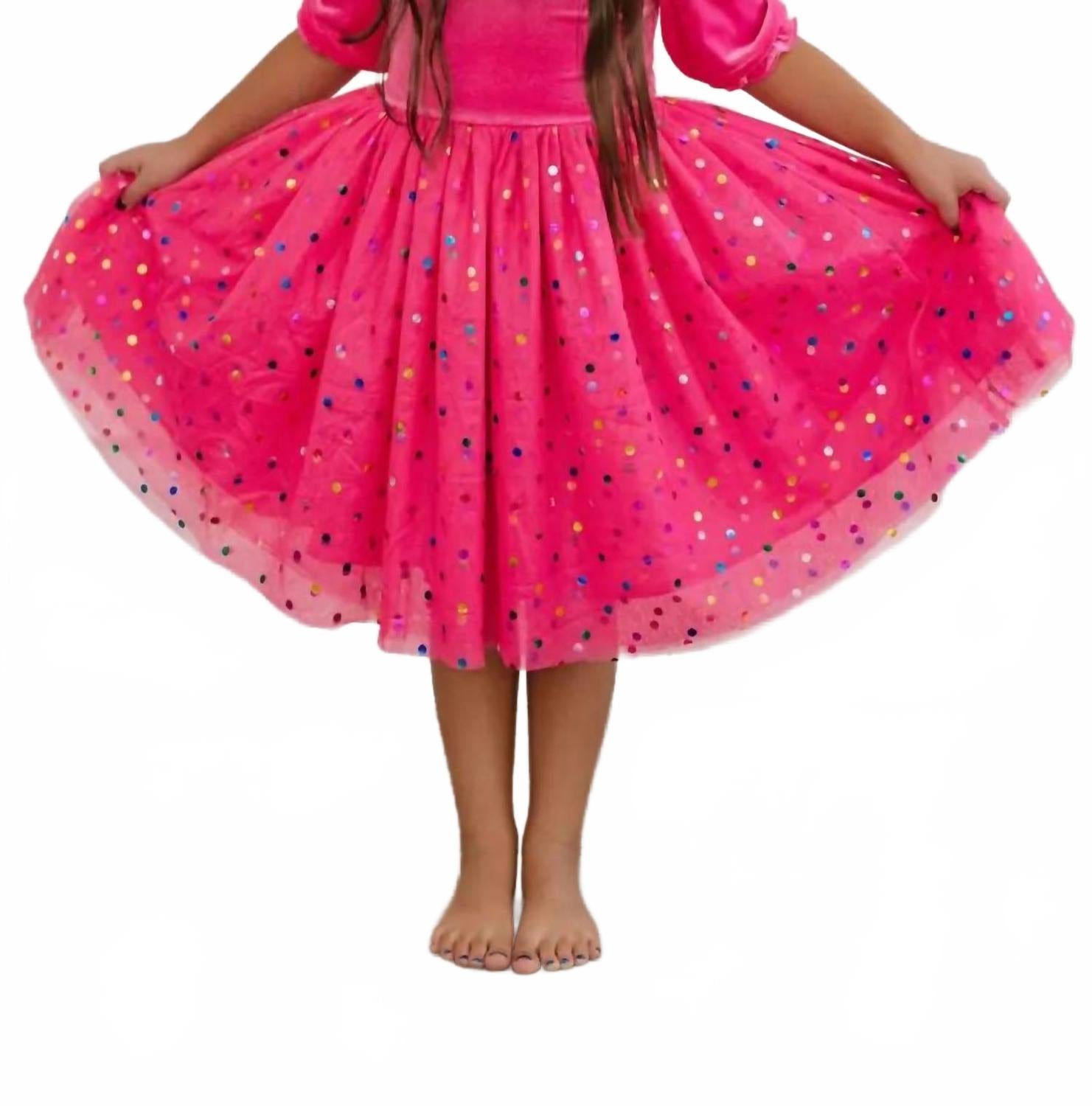 Представляем платье Diana в цвете Confetti Pop от Ollie Jay - восхитительное дополнение к любому гардеробу в ярко-розовом оттенке. Это женское платье с рукавами длиной 3/4 с эластичными манжетами, роскошным бархатным лифом с глубоким вырезом на спине и игривой юбкой из четырехслойного тюля, украшенной вышивкой в стиле конфетти. Это фактурное изделие из мягкого полиэстера идеально подходит для летних дней рождения или любого другого случая, требующего нотки изысканности. Это повседневное, но в то же время очаровательное платье идеально подходит для праздников или просто для домашнего наряда.