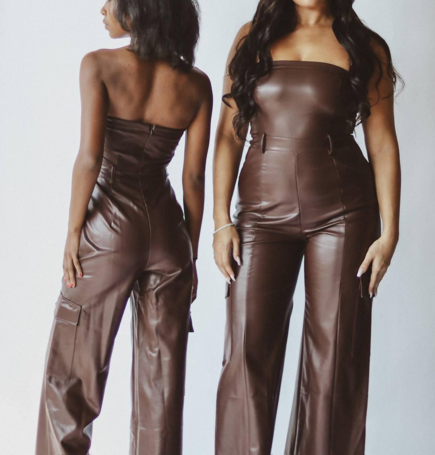 Этот комбинезон-труба из веганской кожи с карманами-карго, эластичным кроем и молнией на спине. Он также имеет шлевки для ремня и конструкцию без бретелек.