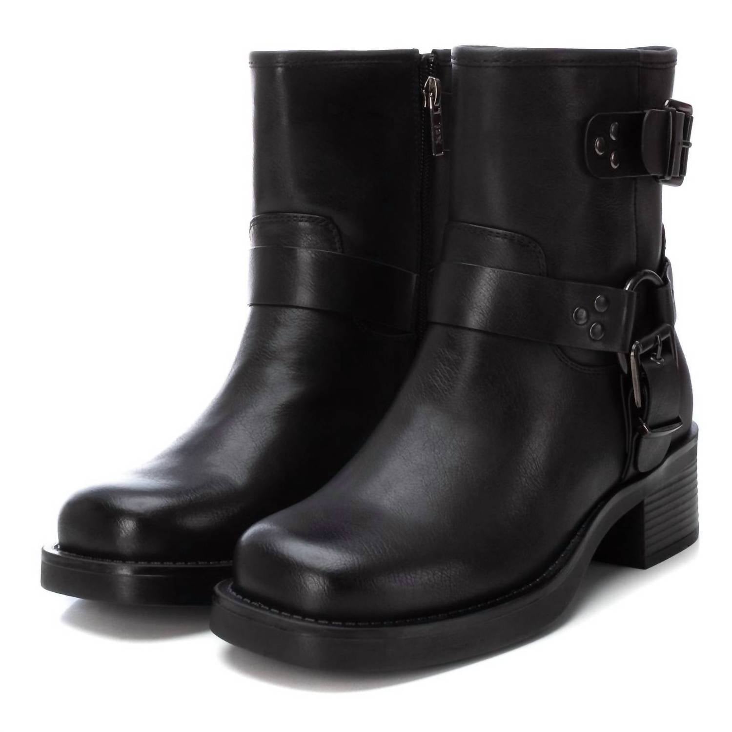 Станьте стильными с женскими байкерскими ботинками Xti - стильным дополнением к любому гардеробу. Эти черные ботильоны из высококачественной искусственной кожи с застежкой-молнией сбоку для удобства надевания дополнены декоративными пряжками и металлическими деталями. Блочный каблук высотой 1,5 дюйма добавляет высоты, не жертвуя комфортом, а легкая, прочная и нескользящая резиновая подошва обеспечивает комфорт. С уверенностью следуйте байкерскому тренду этого сезона, ведь эта модель, сертифицированная как веганский продукт, обеспечивает воздухопроницаемость и мягкую стельку для максимального комфорта.