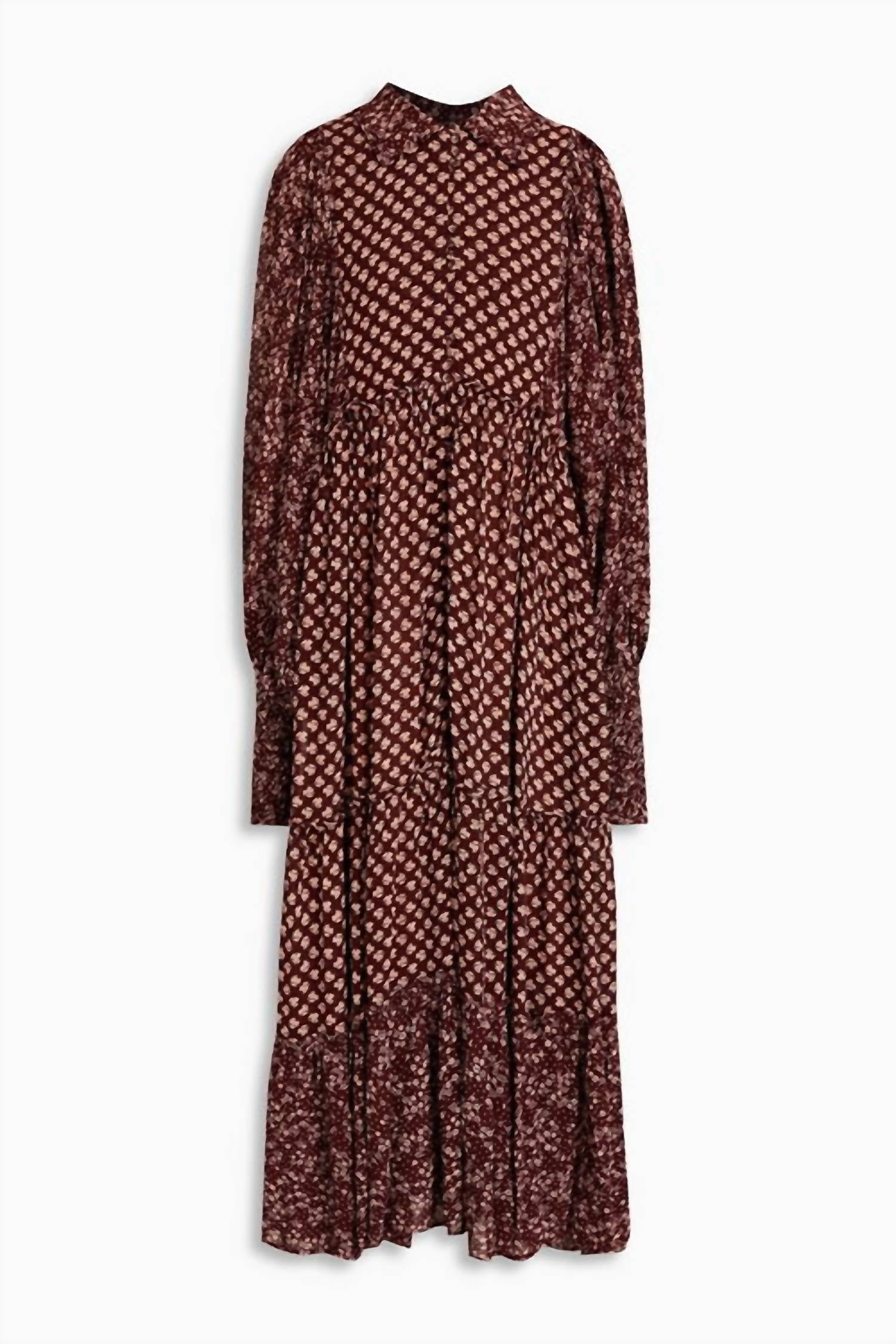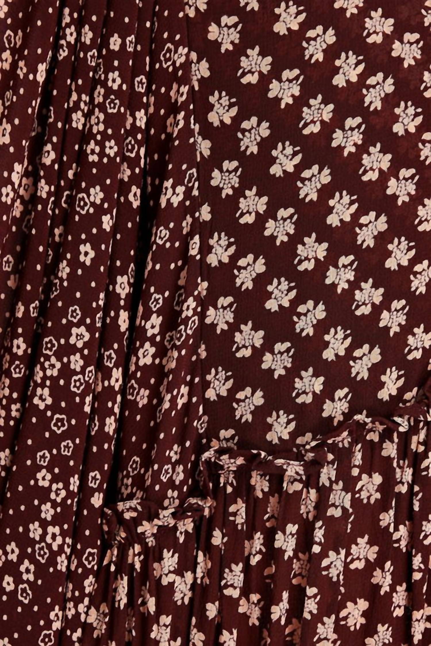 Просто добавьте шлепанцы или мюли, и все готово. Оцените элегантность платья Drapy Georgette от byTiMo, идеально сочетающего стиль и экологичность. Это платье с длинными объемными рукавами и присборенными манжетами, изготовленное из 100% экологичного вискозного жоржета, отличается струящимся силуэтом, длиной макси и свободным кроем. Платье украшено нежным цветочным узором насыщенного сливового оттенка, а оборки на воротнике и юбке придают ему женственности. Практичная застежка на пуговицы, отложной воротник и карманы делают его идеальным вариантом для отпуска или весенней прогулки.
