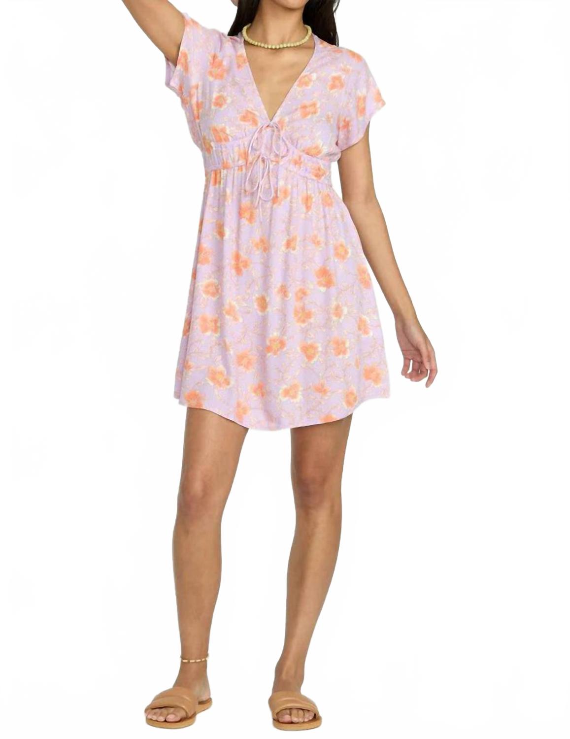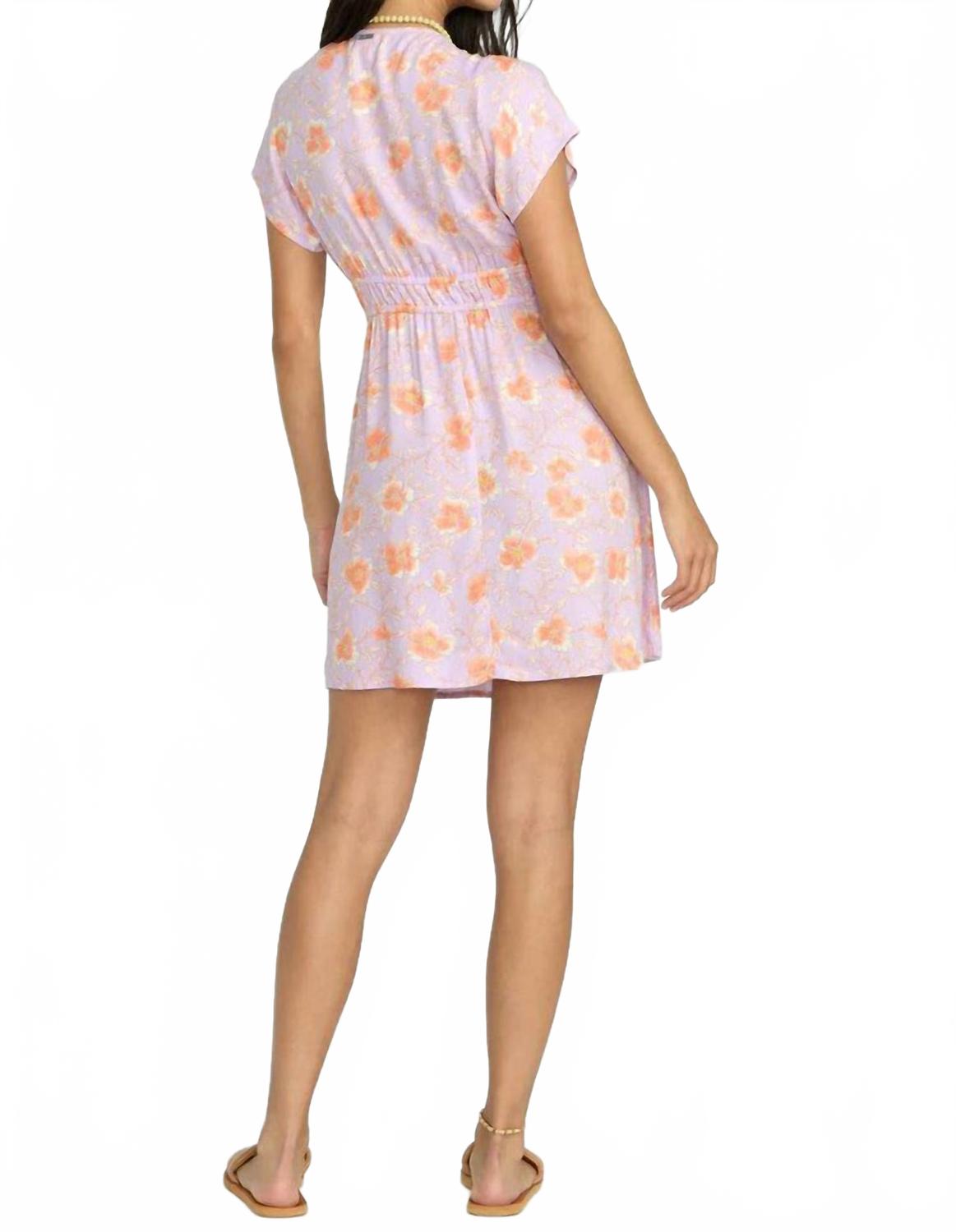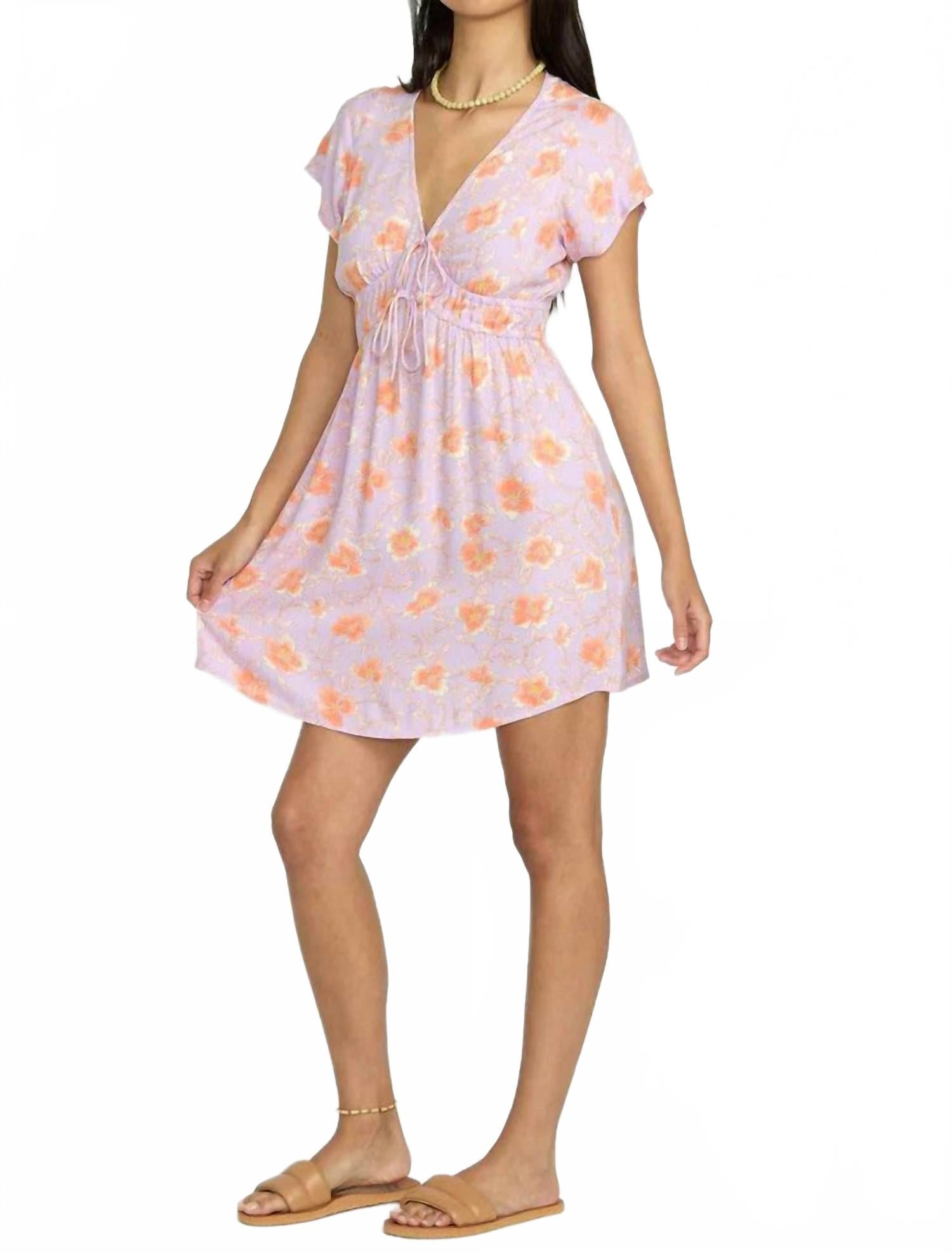 Повседневное, удобное и милое! Платье, которое вы будете носить весь сезон. Дополните свой весенний гардероб платьем Warm Rays от Billabong из легкого вискозного крепа с цветочным узором цвета аметиста. Это мини-платье с потрясающим V-образным вырезом и короткими рукавами-крылышками создает шикарный и непринужденный образ. Облегающий лиф, эластичная талия с завязками и свободная струящаяся юбка - все это воплощает комфорт и стиль. Материал: 100% вискоза. Длина: 34 дюйма (81 см) с высоким плечом (HPS). Застежка: на застежку.