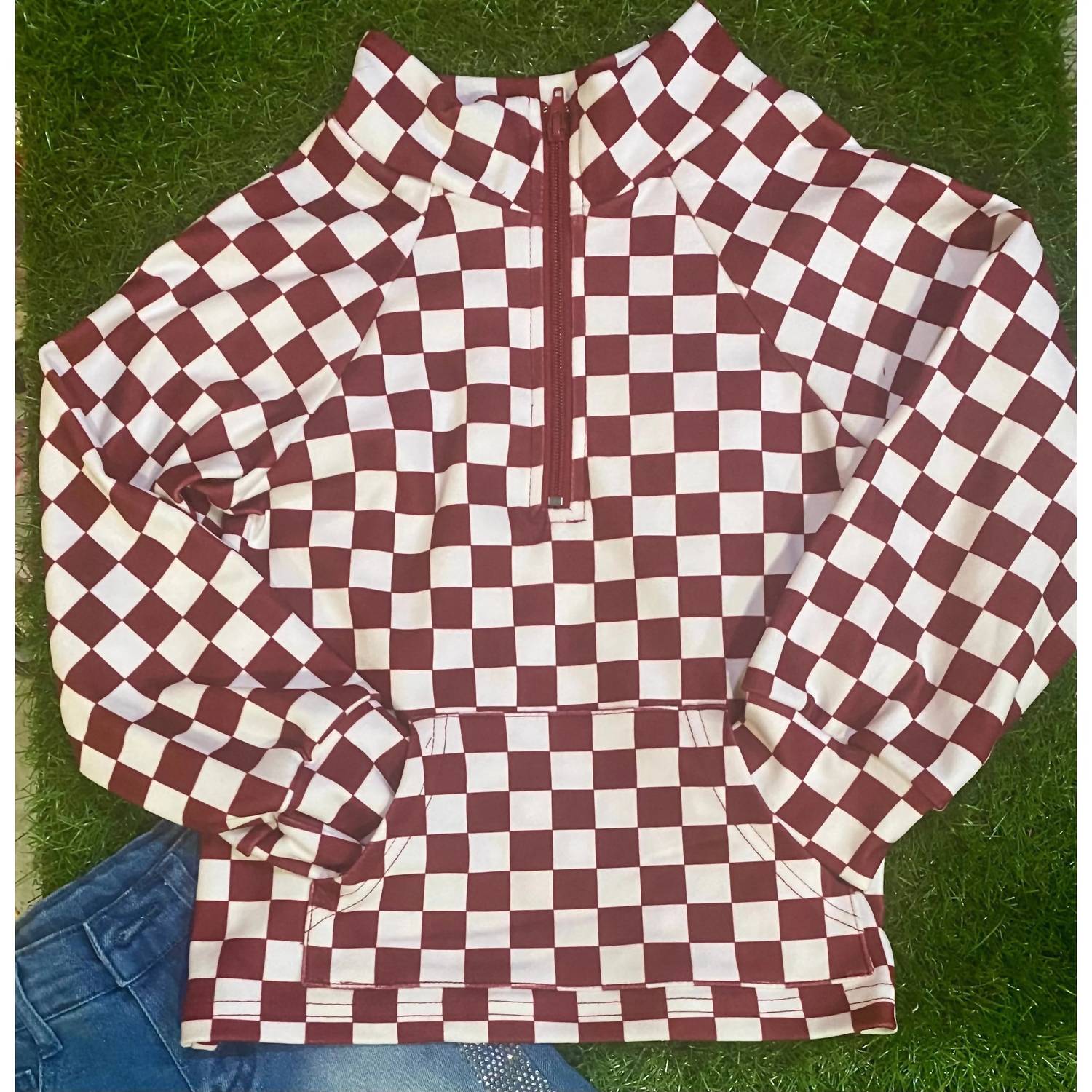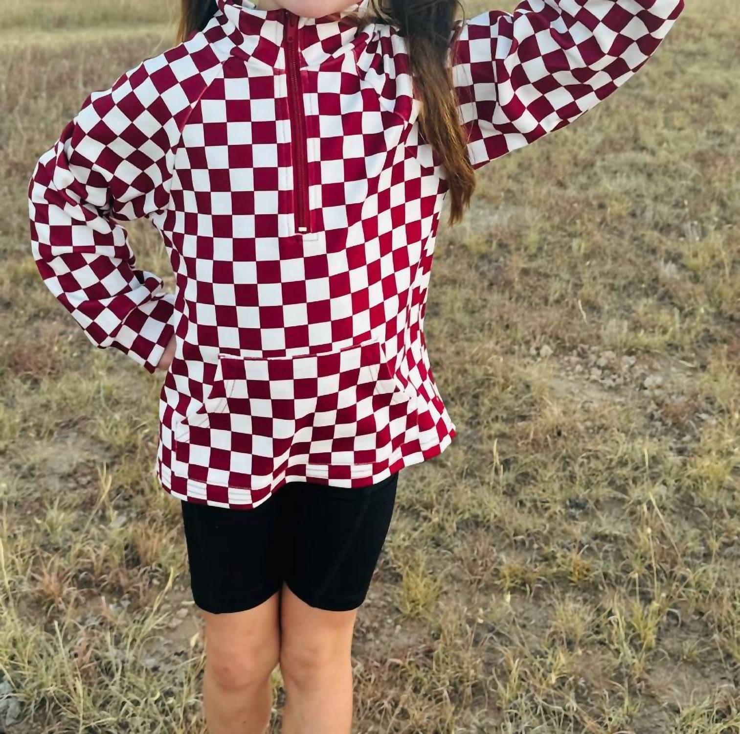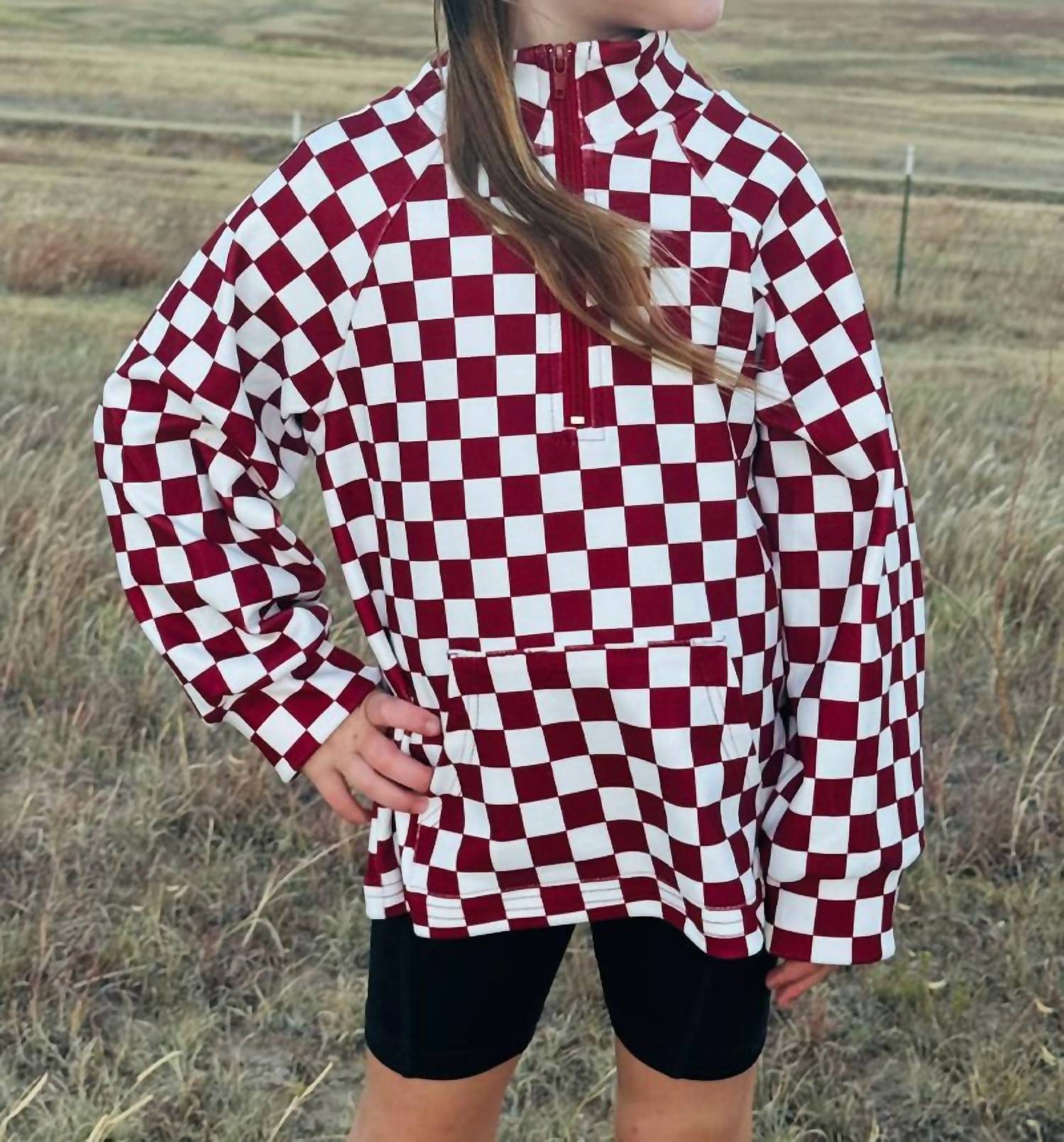Этот свитер с бордовым клетчатым принтом, длинными рукавами и удобной полумолнией спереди обеспечивает универсальность. Изготовленный из мягкой и эластичной смеси 32% хлопка, 56% вискозы и 12% спандекса, он обеспечивает комфорт и гибкость. Удобный карман-кенгуру добавляет практичности этой очаровательной вещи.