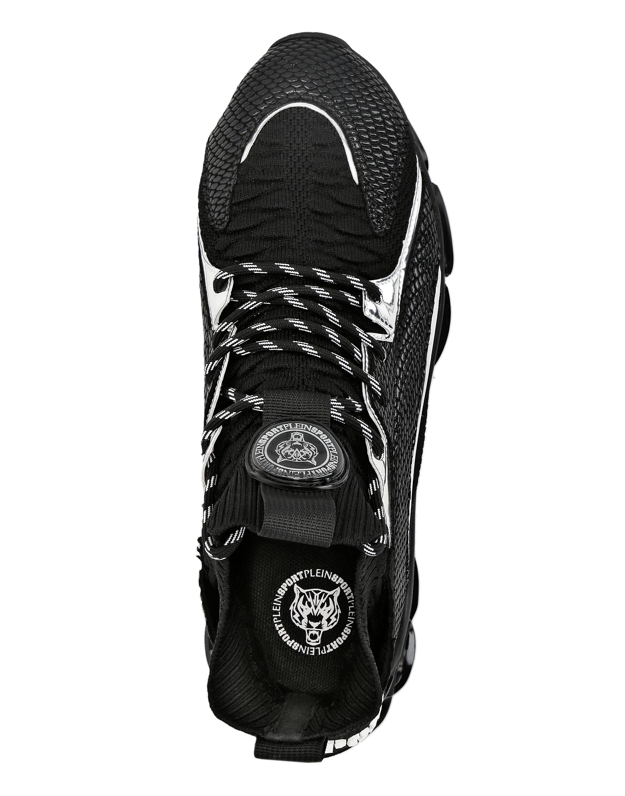 Верх этих эксклюзивных высоких кроссовок Tiger адаптируется к движениям стопы, обеспечивая идеальную и безопасную посадку, а также эффективную и плавную амортизацию. ● Верхний трикотажный материал и накладные элементы обеспечивают плотное и безопасное прилегание. ● Люверсы соединяют многослойную оболочку ● Двухцветные трубчатые шнурки ● Прорезиненная нашивка с культовым изображением тигра на язычке ● Надпись Plein Sport на заднике ● Высокотехнологичная прорезиненная, эргономичная, амортизирующая, сверхлегкая перфорированная промежуточная подошва ● Подошва имеет форму, обеспечивающую оптимальное сцепление
