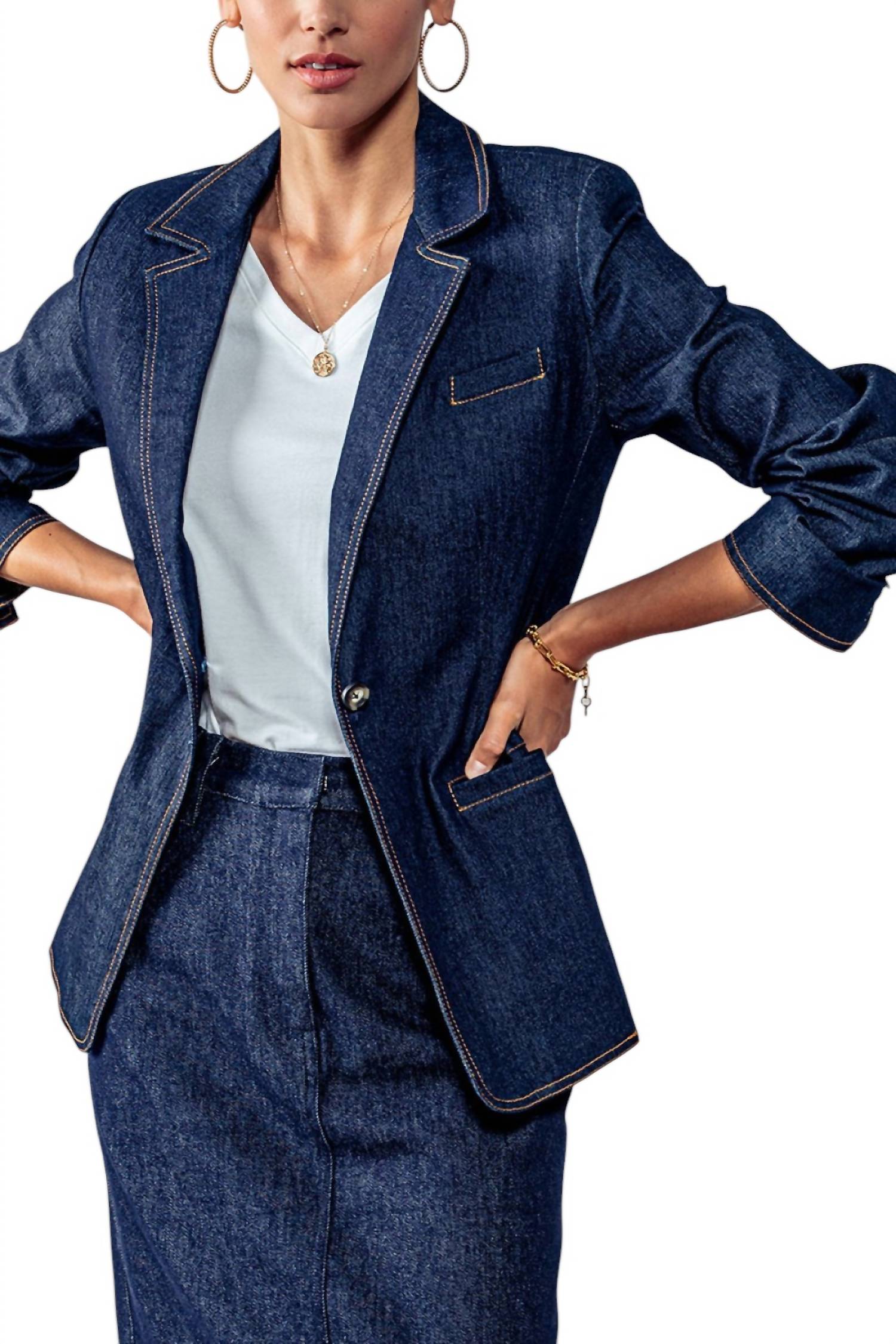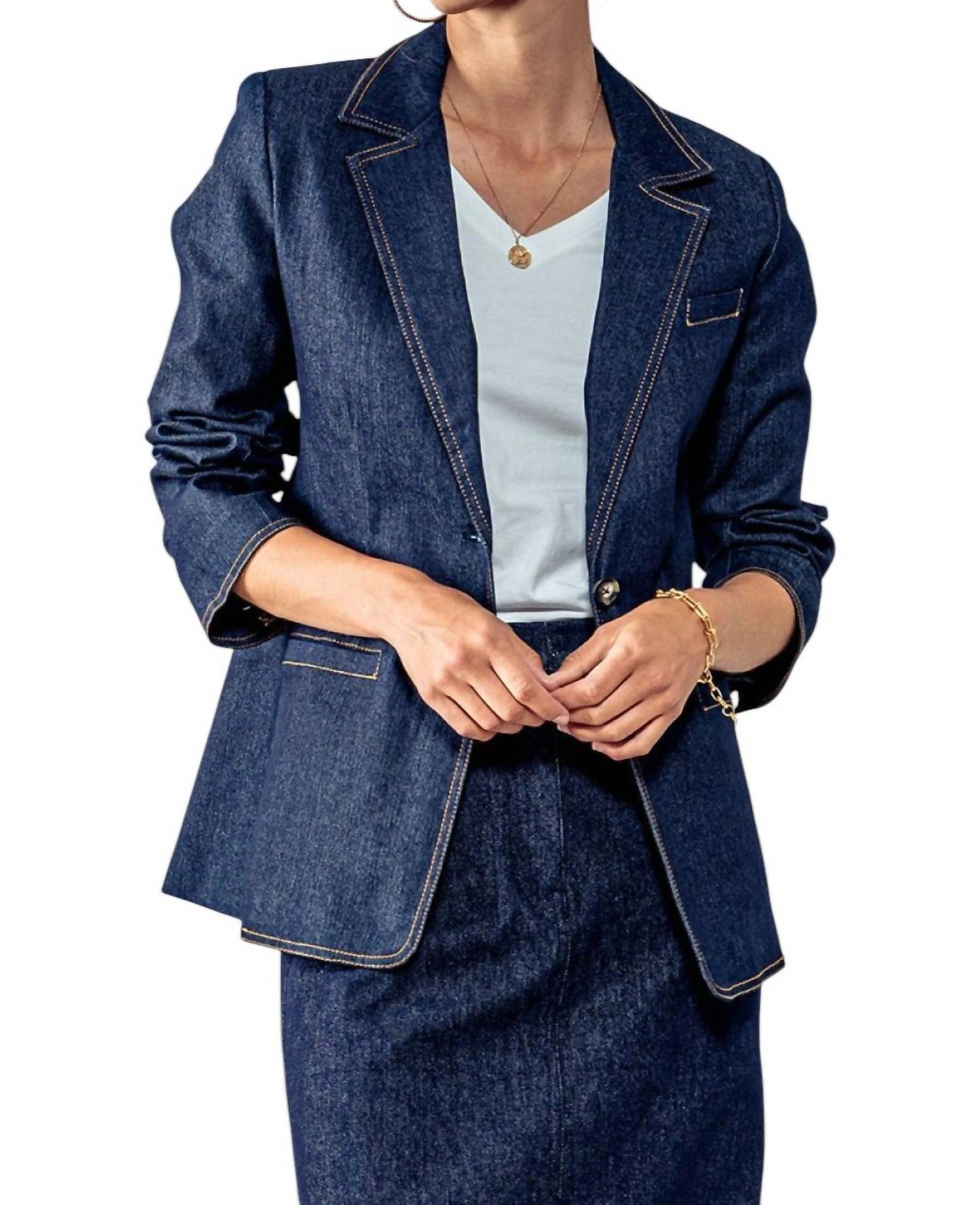 Этот блейзер с длинными рукавами и фактурной отделкой, которая подчеркивает контрастную джинсовую ткань с контурной строчкой, имеет классический воротник и практичные карманы, а застежка на пуговицы обеспечивает надежную посадку. Идеально подходит для женщин, которые ценят изысканный и в то же время современный образ.