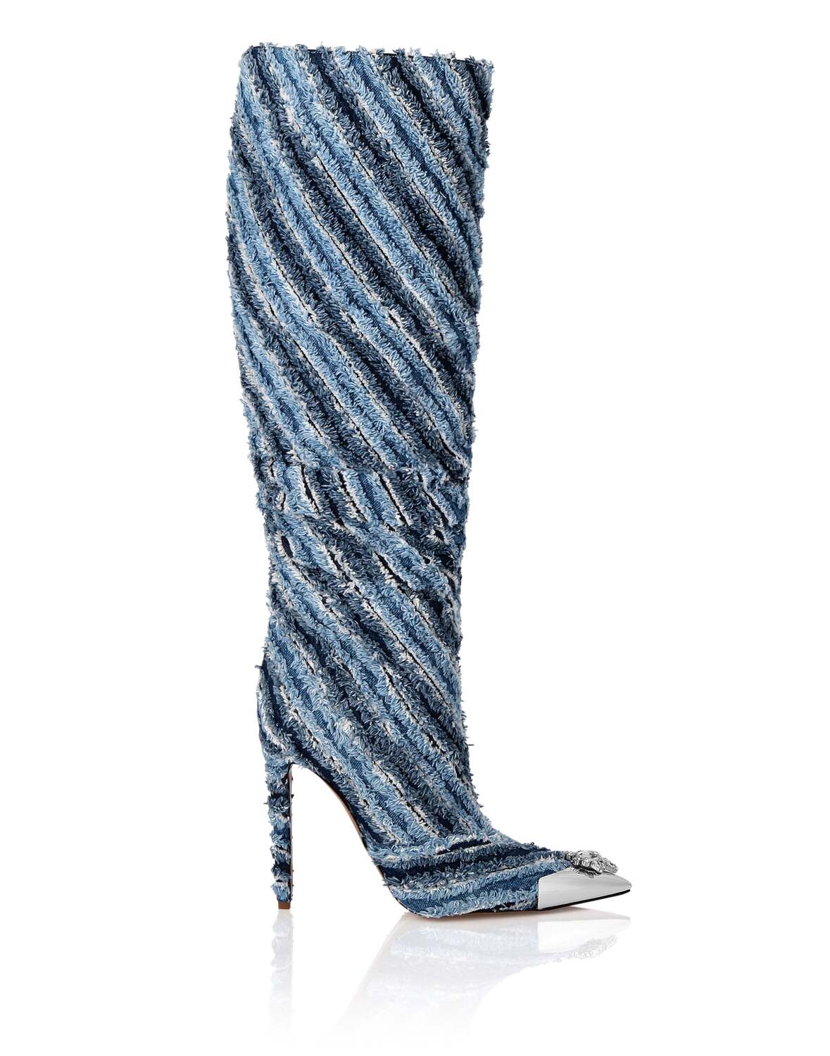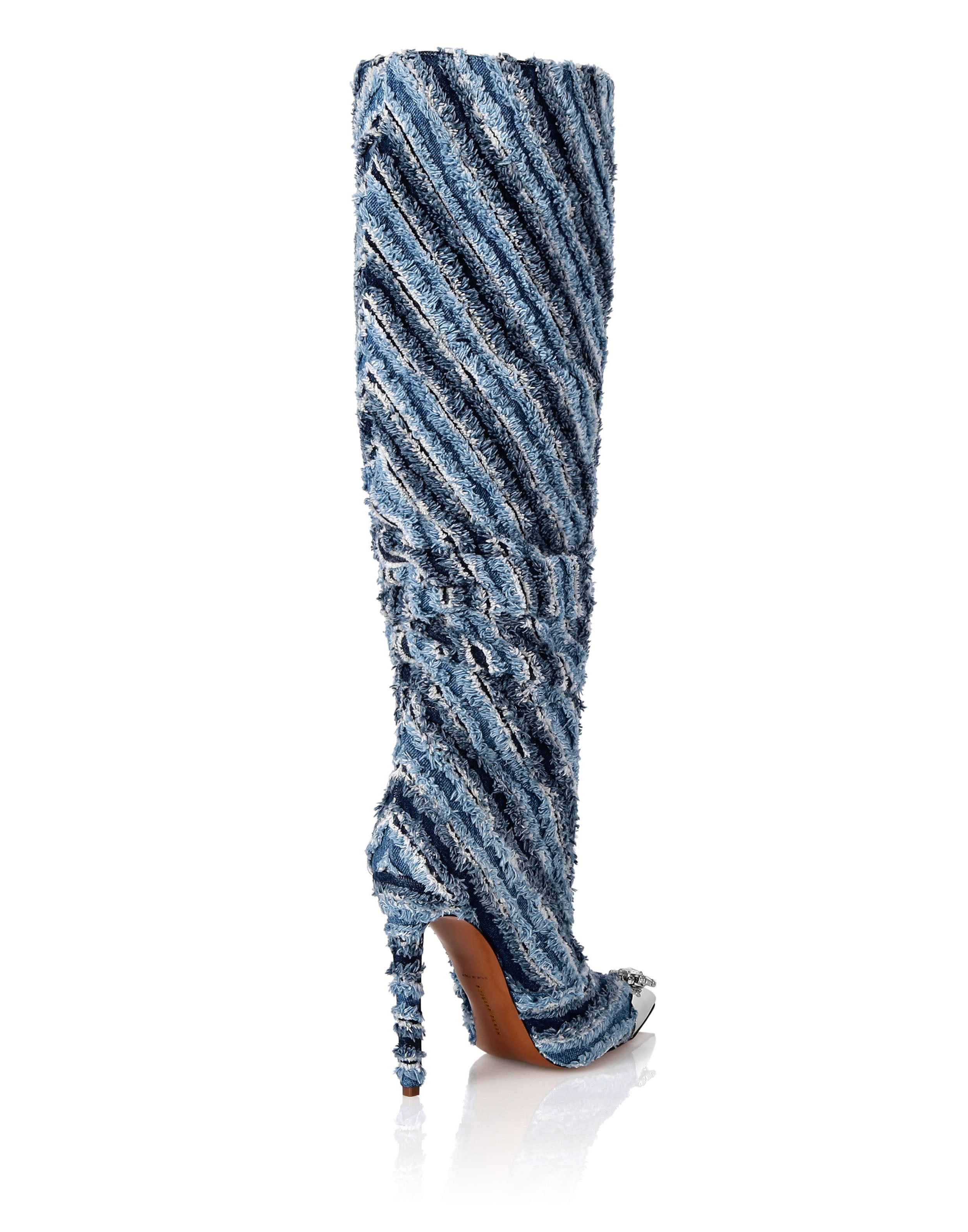 Продемонстрируйте свою смелость и стильную сторону в этих джинсовых ботинках в стиле пэчворк. Взгляните на детали. ● Верх из денима с бахромой и пэчворком ● Позолоченный носок с вмонтированными стразами ● С рюшами на голенище ● Застежка-молния с внутренней стороны ● Подошва из натуральной кожи ● Внутренняя подкладка и стелька ● Каблук высотой 12 см с подкладкой