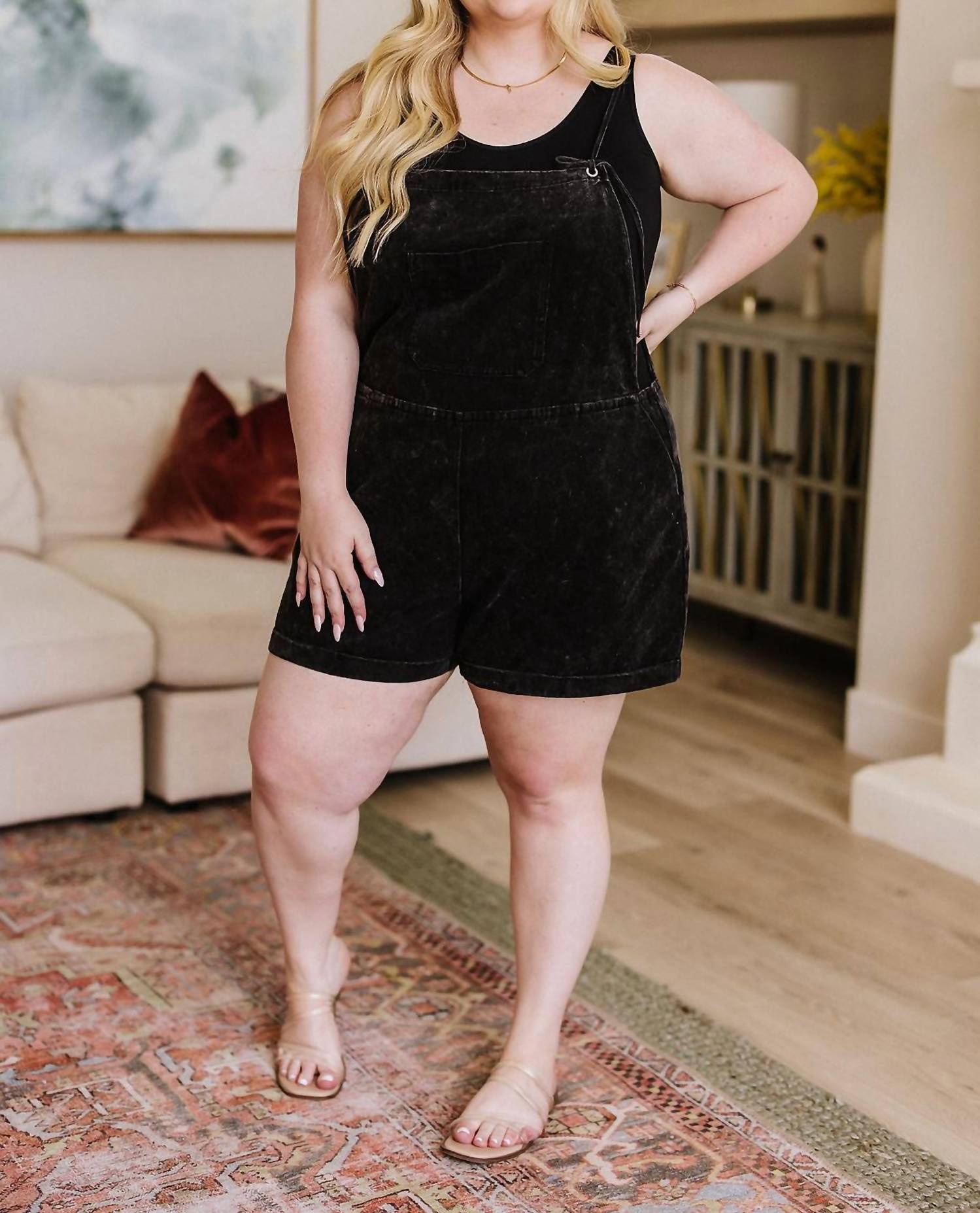 Джинсовая саржа. Не тянется. Минеральная стирка. Регулируемые завязывающиеся лямки. Карманы. Манжеты на закрепках. Облегает по бедрам. 100% хлопок. Размер в размер.