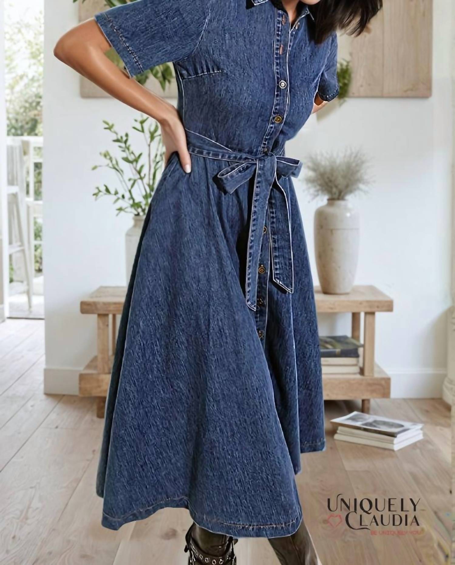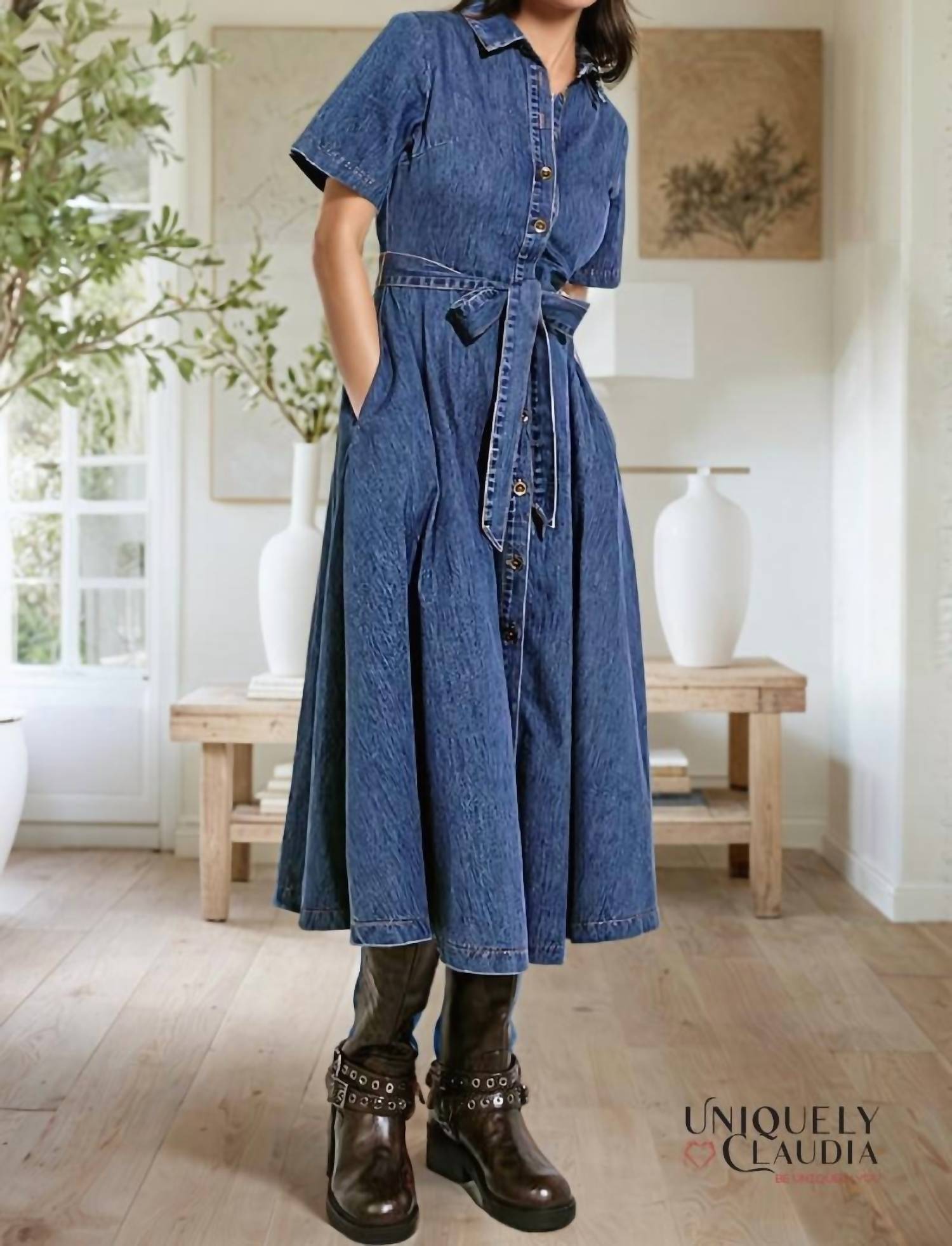 Платье миди настолько универсально, что ваши варианты его ношения безграничны. Окунитесь в непринужденный стиль с платьем миди Gisselle Washed Denim от FLYING TOMATO, выполненным в элегантной средней фактуре для взыскательных женщин. Это платье А-силуэта с классическим воротником и короткими рукавами застегивается на пуговицы для удобства ношения. Изготовленное из 83% хлопка и 17% вискозы, оно удобное и подчеркивает фигуру, а боковые карманы обеспечивают практичность. Уход за этим импортным изделием: ручная стирка в холодной воде и сушка на веревке, чтобы сохранить его уникальный винтажный вид.