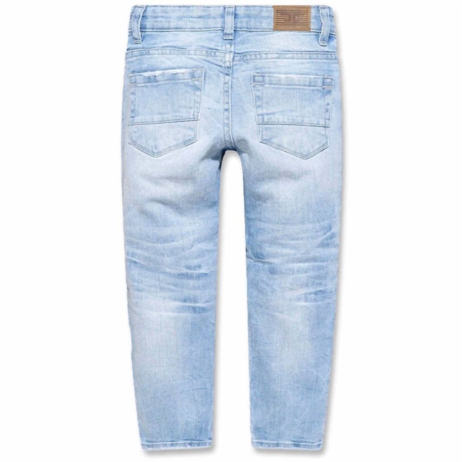 Представляем джинсы Boulder Denim для мальчиков от JORDAN CRAIG небесно-голубого оттенка, создающие аутентичный винтажный образ. Эти джинсы изготовлены из суперэластичного материала, состоящего из 99% хлопка и 1% эластана, что обеспечивает максимальный комфорт благодаря стандартной посадке и зауженному силуэту от колена до щиколотки. Классическая потертость и небольшие потертости по всей длине придают им прочный шарм, воплощая вневременной стиль, идеально подходящий для повседневной носки.