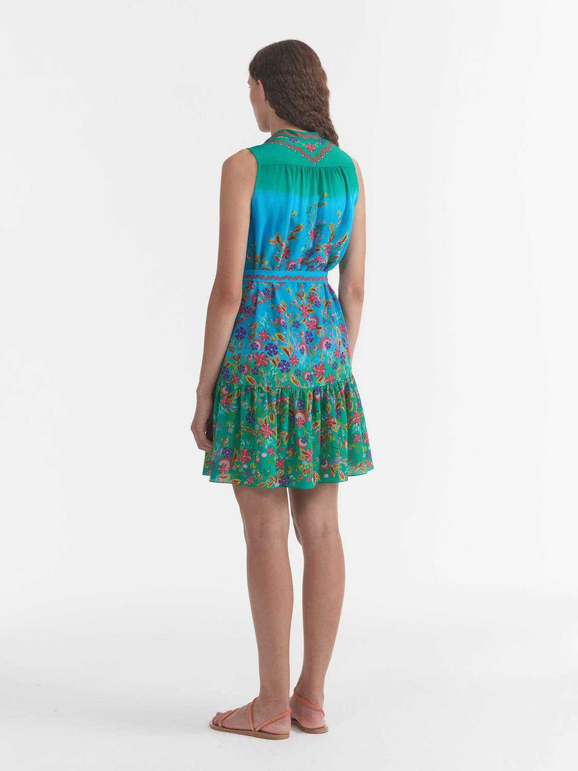 Короткое и воздушное платье для теплых дней. Платье Tilly в цвете «Летний венок» - это платье-рубашка с изящно оборчатым лифом. Свободный силуэт, пояс на завязке, подчеркивающий талию. Платье-рубашка с заниженной талией. Пояс на завязке. Потайная планка с пуговицами спереди. Воротник-стойка. Каскадная планка с оборкой. Без рукавов. Присборенный подол. Легкая, неэластичная ткань.