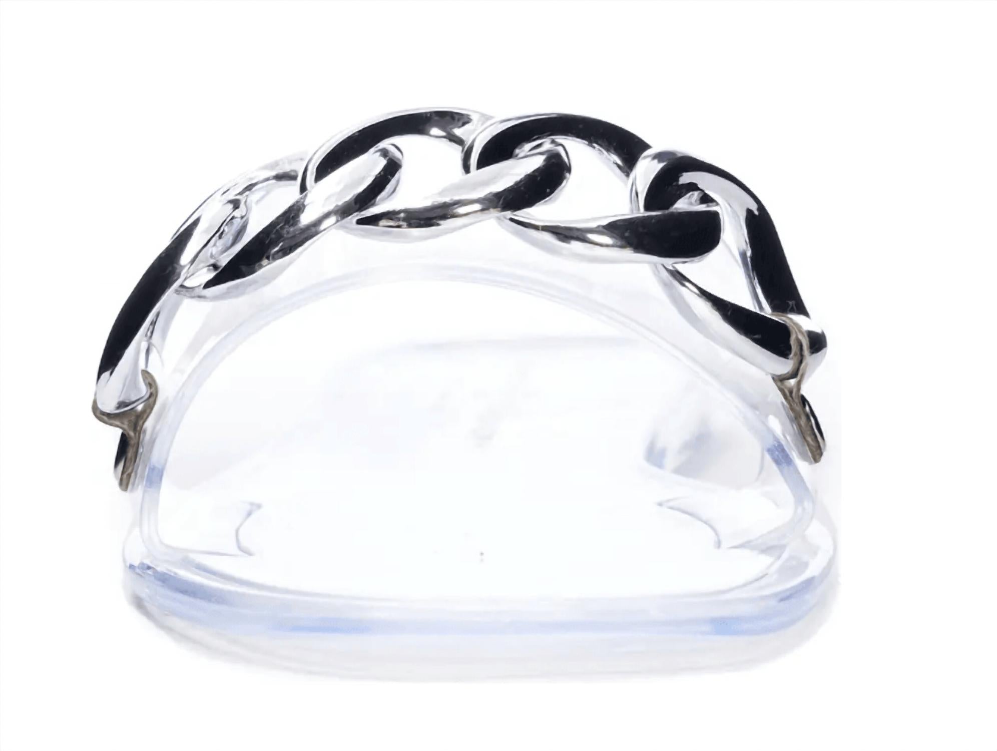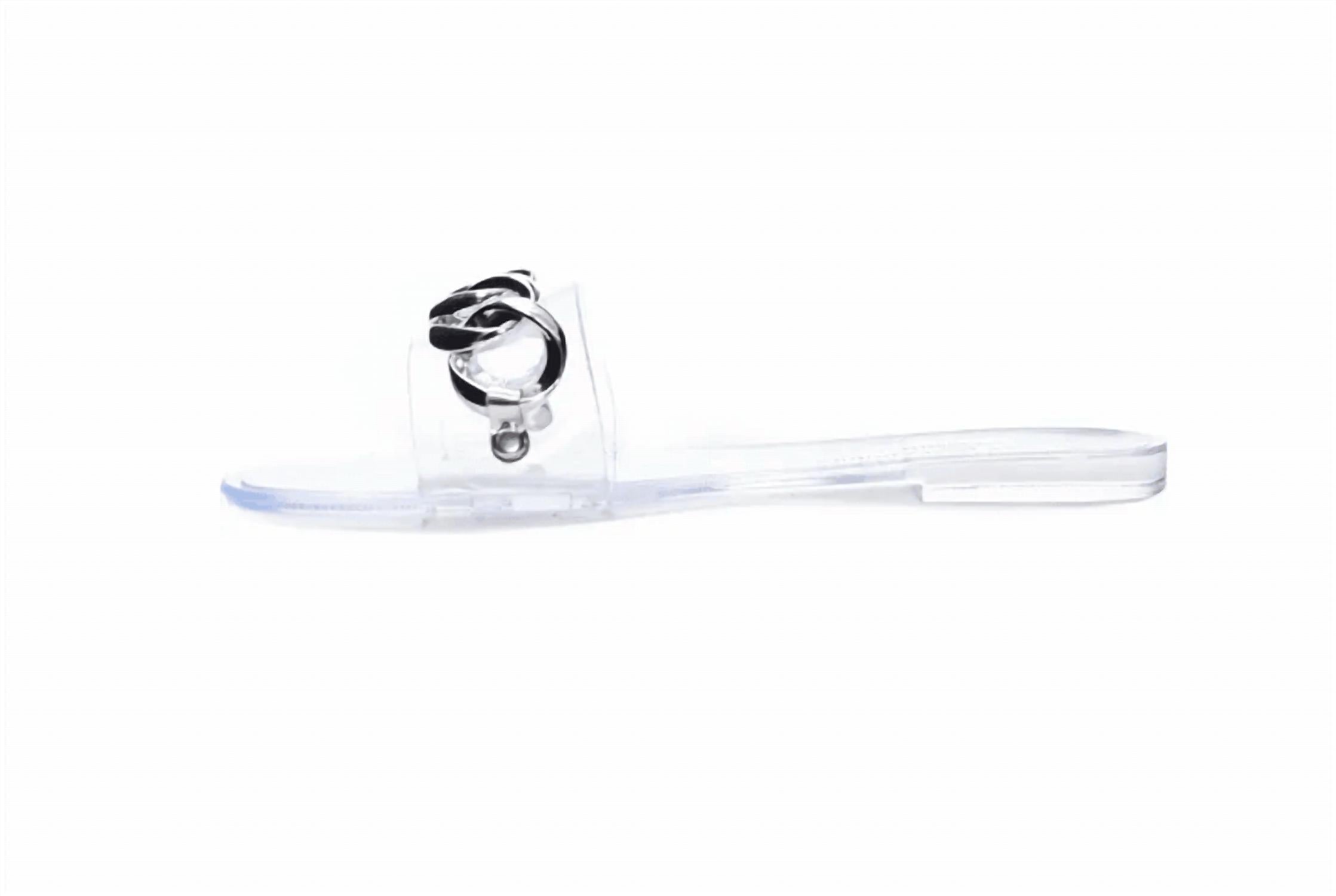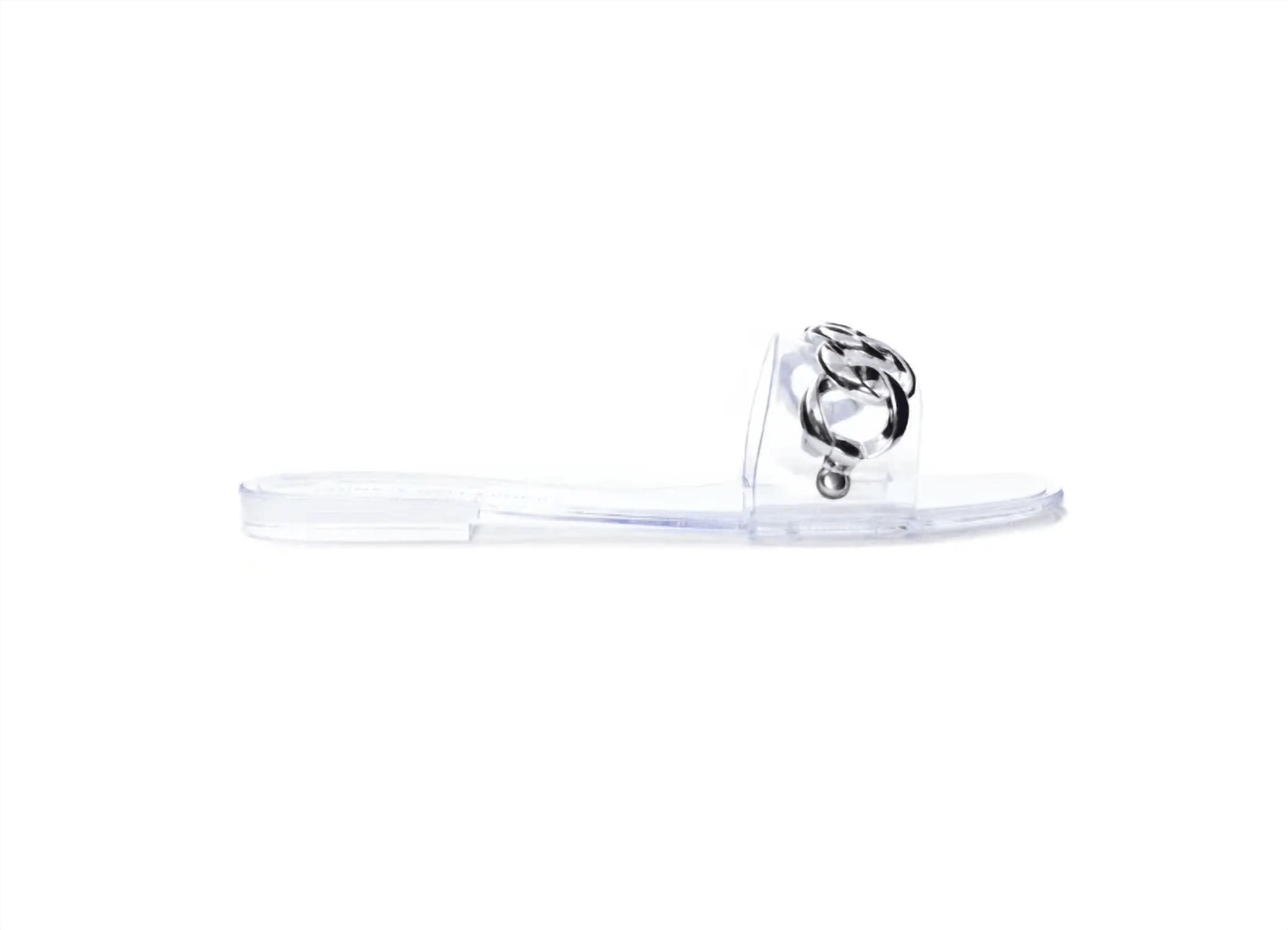 Прозрачные босоножки из желеобразной ткани с металлической серебристой цепочкой. Размер соответствует заявленному; если размер промежуточный, рекомендуем взять на размер больше.