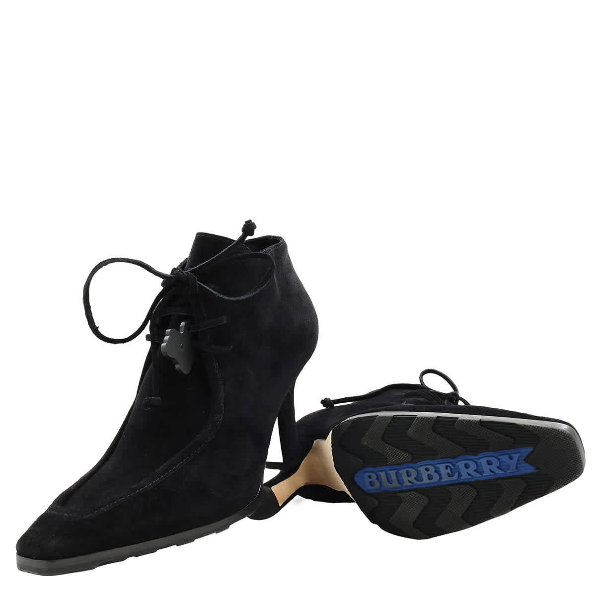 Женские ботинки Burberry. Цвет: черный. Модель: ботильоны. Модель «вамп»: шнуровка. Материал верха: замша. Замшевые ботинки Burberry Storm. Эти замшевые ботинки длиной до щиколотки черного цвета с подвеской-логотипом, тисненой подошвой с логотипом, прошитыми краями, шнуровкой спереди, квадратным носком и каблуком средней высоты. 100% замша. Сделано в Италии.