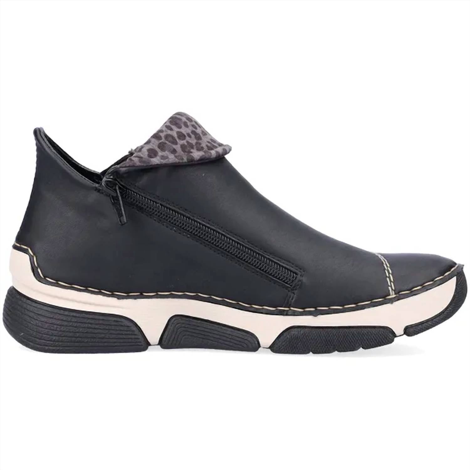 Наслаждайтесь каждым днем в этих очаровательных кроссовках. Представляем стильную и универсальную модель RIEKER Angela 83 - кроссовки и ботильоны, идеально подходящие для уличной моды осенью и зимой. Эти женские кроссовки с текстильным верхом и подкладкой в эффектном черно-серо-леопардовом цвете. Удобная боковая застежка-молния и рифленые вставки на подошве обеспечивают дополнительное сцепление. Эти кроссовки идеально сочетаются с леггинсами или широкими брюками благодаря плоской пятке высотой менее 2,5 см и удобному круглому носку.