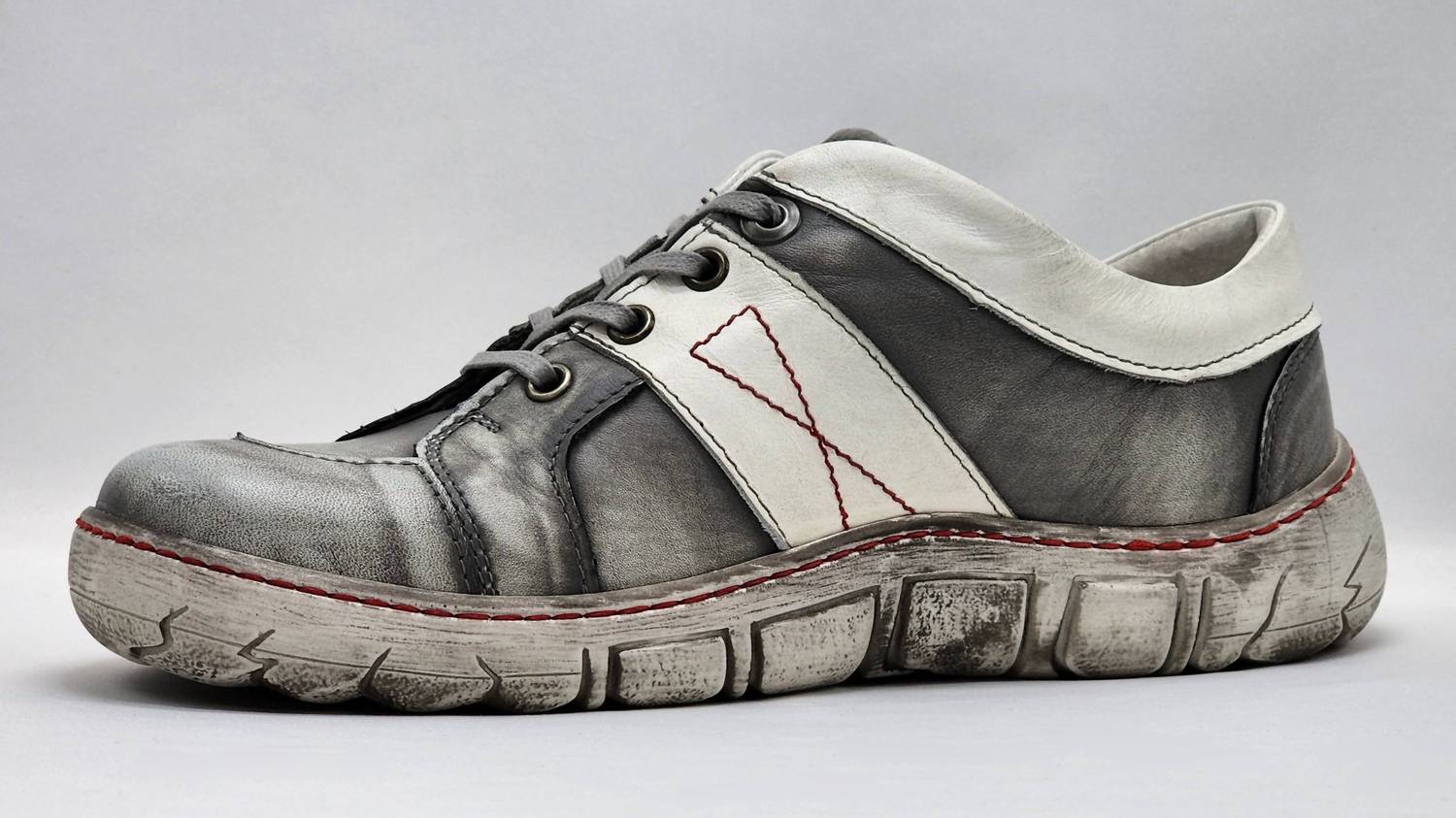 Серо-белый цвет с красными акцентами. Традиционный стиль. Изготовлены из натуральной кожи. Очень легкие. Обеспечивают комфорт и удобство в течение всего дня. Идут размер в размер. Изготовлены вручную в Польше.
