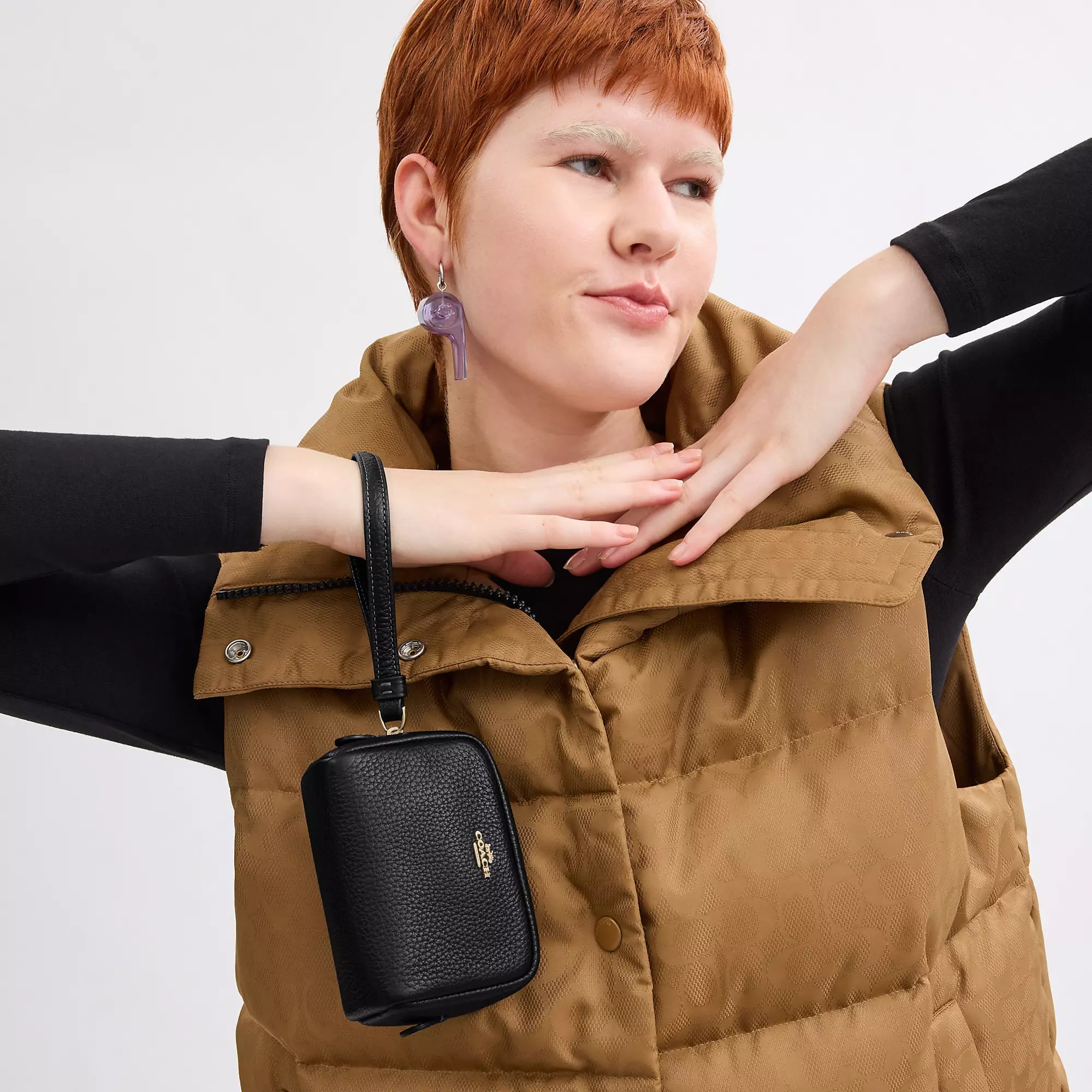 Изысканная зернистая кожа, тканевая подкладка с застежкой-молнией, пришитый ремешок на запястье, 4 1/4 (Д) x 3 1/4 (В) x 2 1/4 (Ш) Модель № CW906 | Сумка-кошелек Coach Outlet - черный
