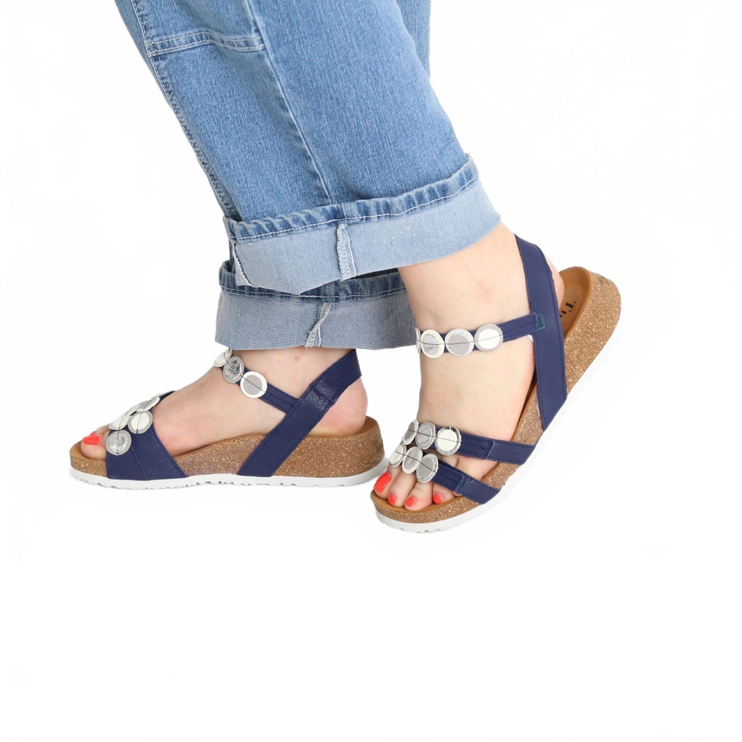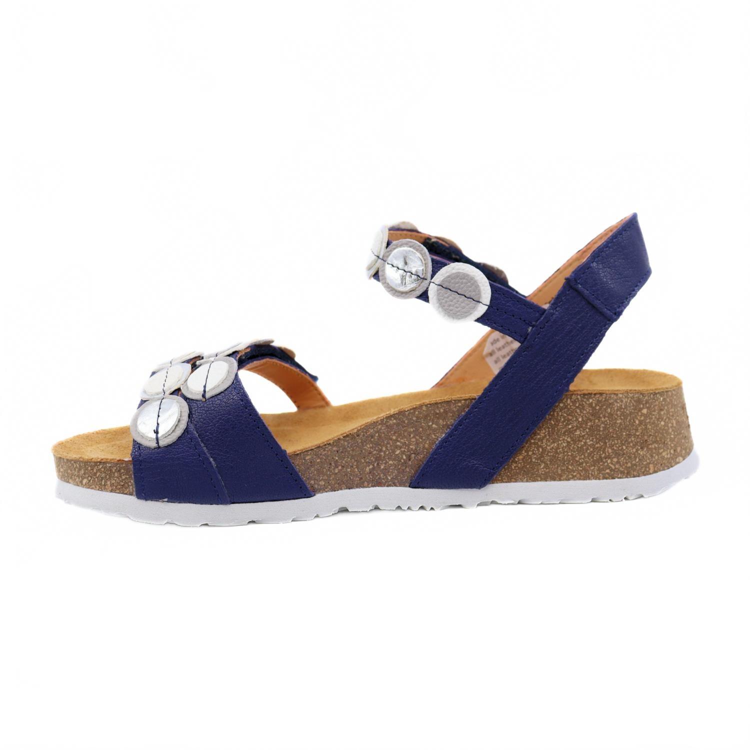 Классические, милые и удобные в течение всего дня. Нам очень нравятся эти сандалии. Вступите в лето с женскими сандалиями Koak от Think!, выполненными из роскошной кожи индиго, в стильном стиле бохо-шик. Эти сандалии с поддерживающей пробковой стелькой оснащены регулируемыми ремешками на липучках для удобной посадки. Клиновидный каблук средней высоты (4,5 см) визуально увеличивает высоту стопы, сохраняя при этом свободную форму и открытый носок. Эти сандалии идеально подойдут для праздников, таких как День независимости, или для путешествий, и станут отличным выбором для создания непринужденного летнего образа.