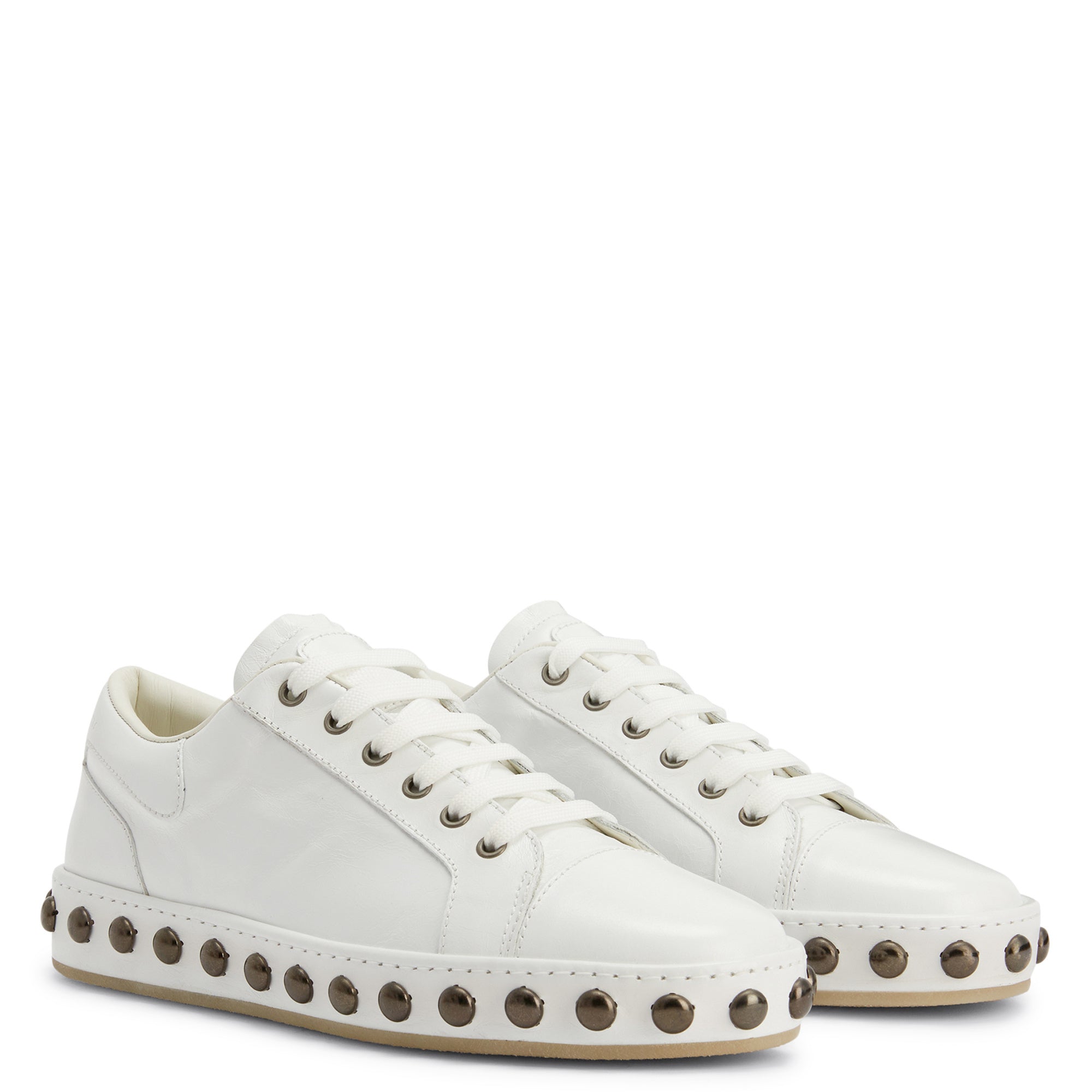 • Вышивка металлическими заклепками цвета оружейной стали на белой кожаной подошве