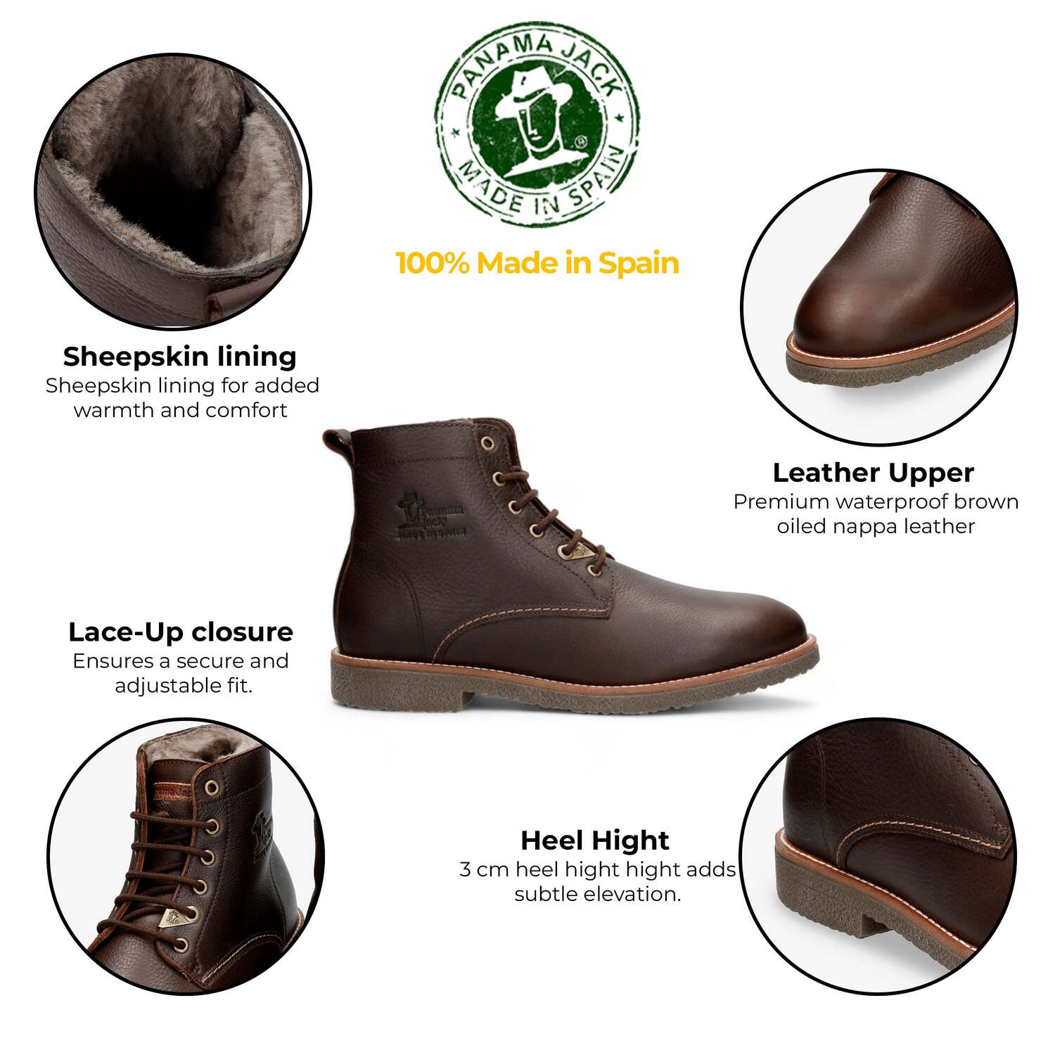 Мужские коричневые ботильоны Glasgow Igloo C1 от Panama Jack дарят тепло, прочность и стиль. Изготовленные из водонепроницаемой коричневой промасленной кожи Napa, эти ботинки разработаны для комфорта и прочности. Роскошная подкладка из овчины сохраняет ноги в тепле в холодную погоду, а анатомическая стелька обеспечивает длительный комфорт. Эти ботинки с гибкой и прочной подошвой из термополиуретана идеально подходят для повседневной носки. Шнуровка обеспечивает надежную посадку, высота голенища 15 см и высота каблука 3 см для элегантного и практичного дизайна. Характеристики: - Водонепроницаемая коричневая промасленная кожа Napa Подкладка из овчины для тепла Анатомическая стелька для комфорта Гибкая и прочная подошва из термополиуретана Шнуровка для надежной посадки Высота голенища: 15 см Высота каблука: 3 см 100% Сделано в Испании