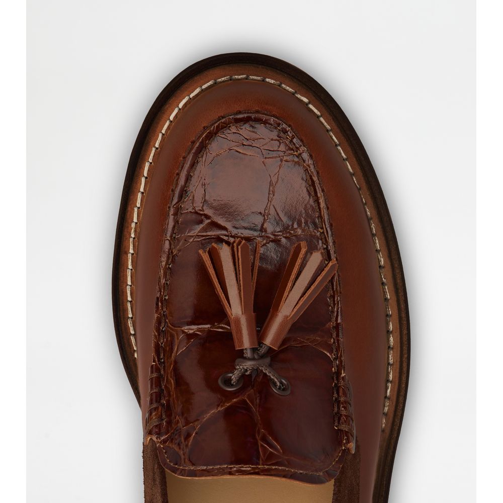 Эти лоферы, сочетающие в себе классическое вдохновение, современный дизайн и мастерство, отличаются подошвой из кожи и резины, подчеркивающей культовый рисунок в виде резиновых камешков. Разработанные совместно с Hender Scheme, эти лоферы изготовлены из изысканной гладкой кожи со вставками под крокодиловую кожу и замшевыми деталями. Ярко выраженная эклектичная модель с выразительным рантом, отсылающим к традиционному японскому стилю.