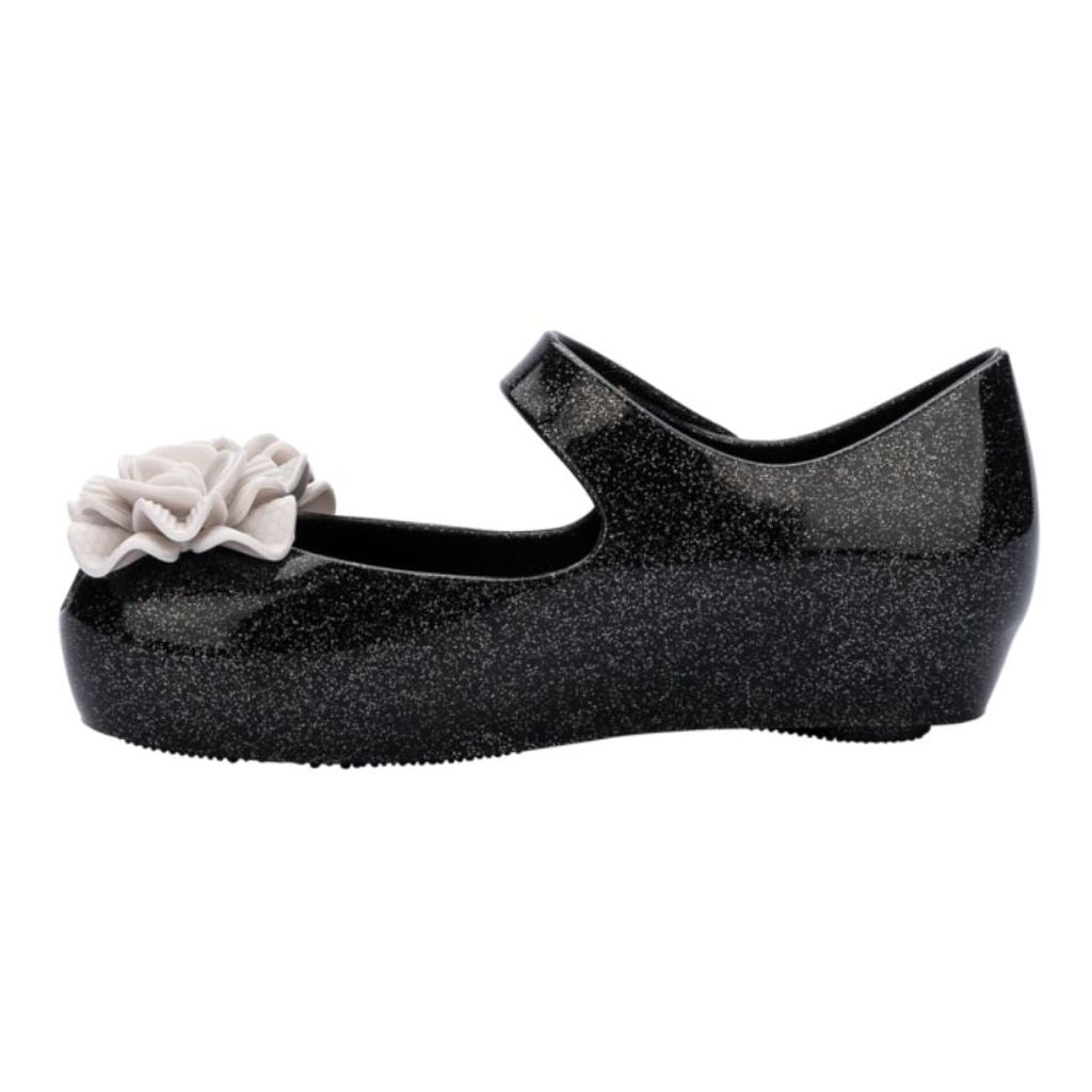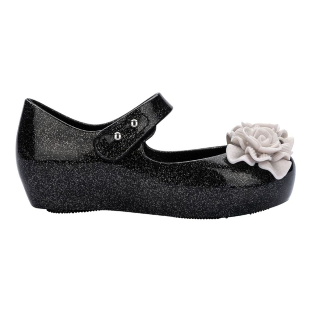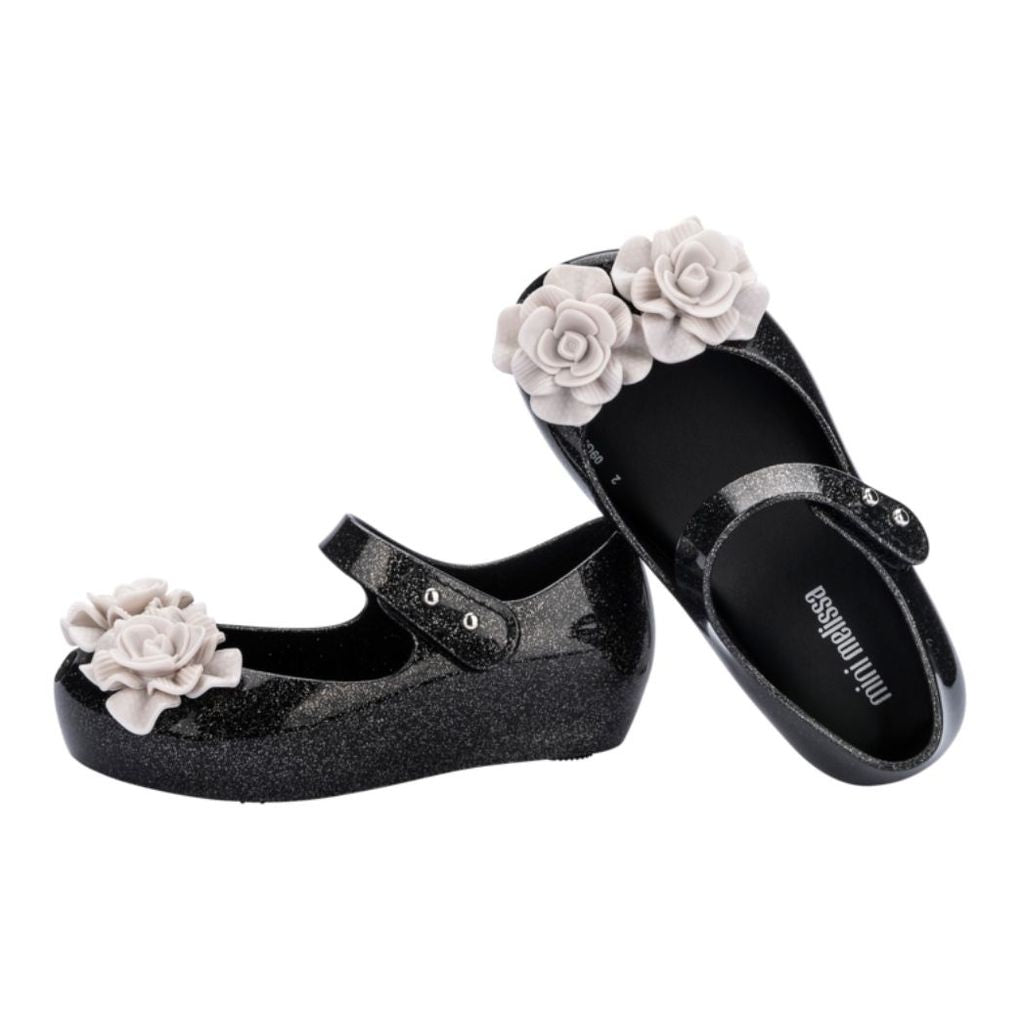Блестящие черные желейные туфли для девочек от Mini Melissa с красивыми цветами цвета слоновой кости на носках. Они изготовлены из ароматного Melflex - перерабатываемого ПВХ, гибкого и удобного. Мягкая внутренняя стелька и скрытая танкетка. Туфли имеют фирменный открытый носок и застежку-липучку на липучке.