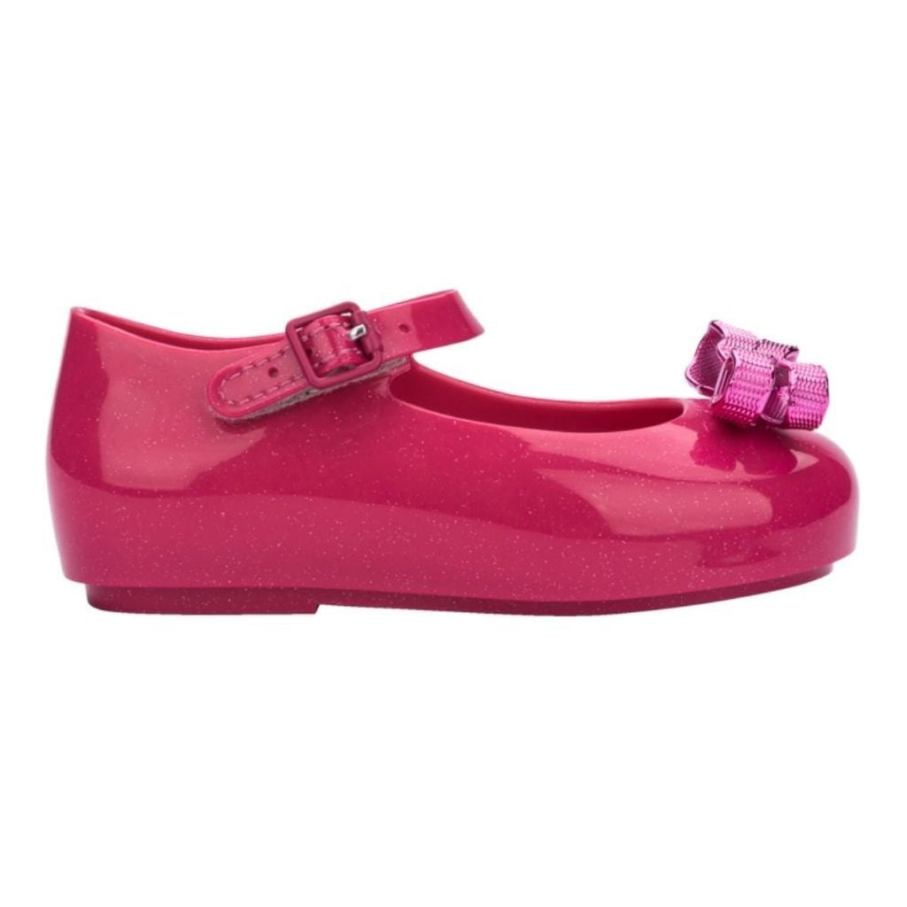 Туфли-гели Kid Girls цвета фуксии, блестящие, розовые, с металлическими бантиками на носках от Mini Melissa. Они изготовлены из ароматного Melflex - перерабатываемого ПВХ, гибкого и комфортного. Мягкая внутренняя стелька и застежка на липучке.
