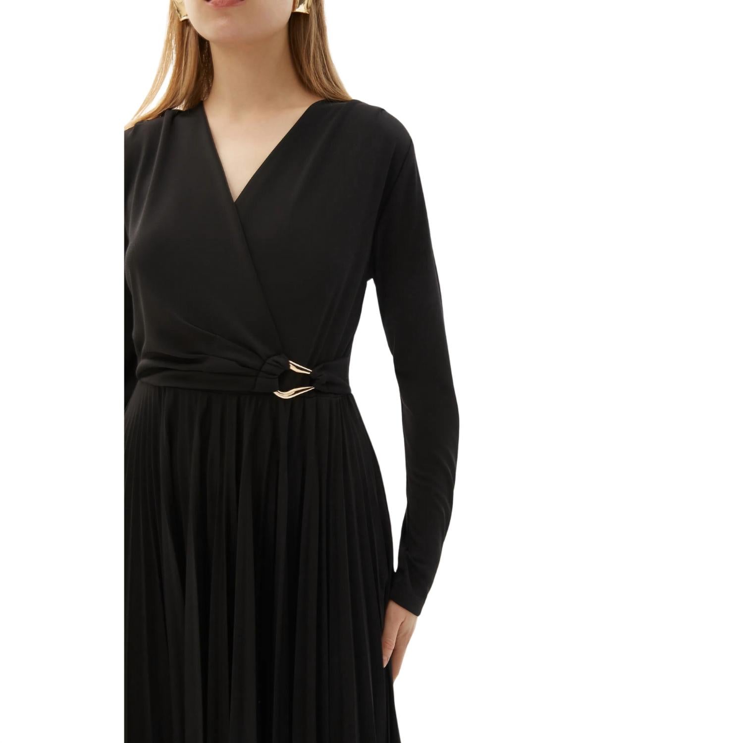 Представляем платье Braeden от EXQUISE - изысканное черное миди-платье для женщин. Платье А-силуэта из 100% полиэстера отличается элегантными длинными рукавами и V-образным вырезом. Благодаря конструкции, которую можно надевать, это однотонное платье сочетает в себе стиль и удобство, идеально подходящие для тех, кто ценит в своем гардеробе непреходящую элегантность.