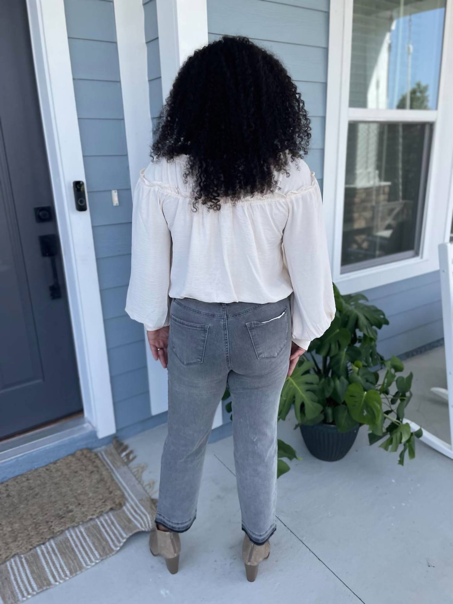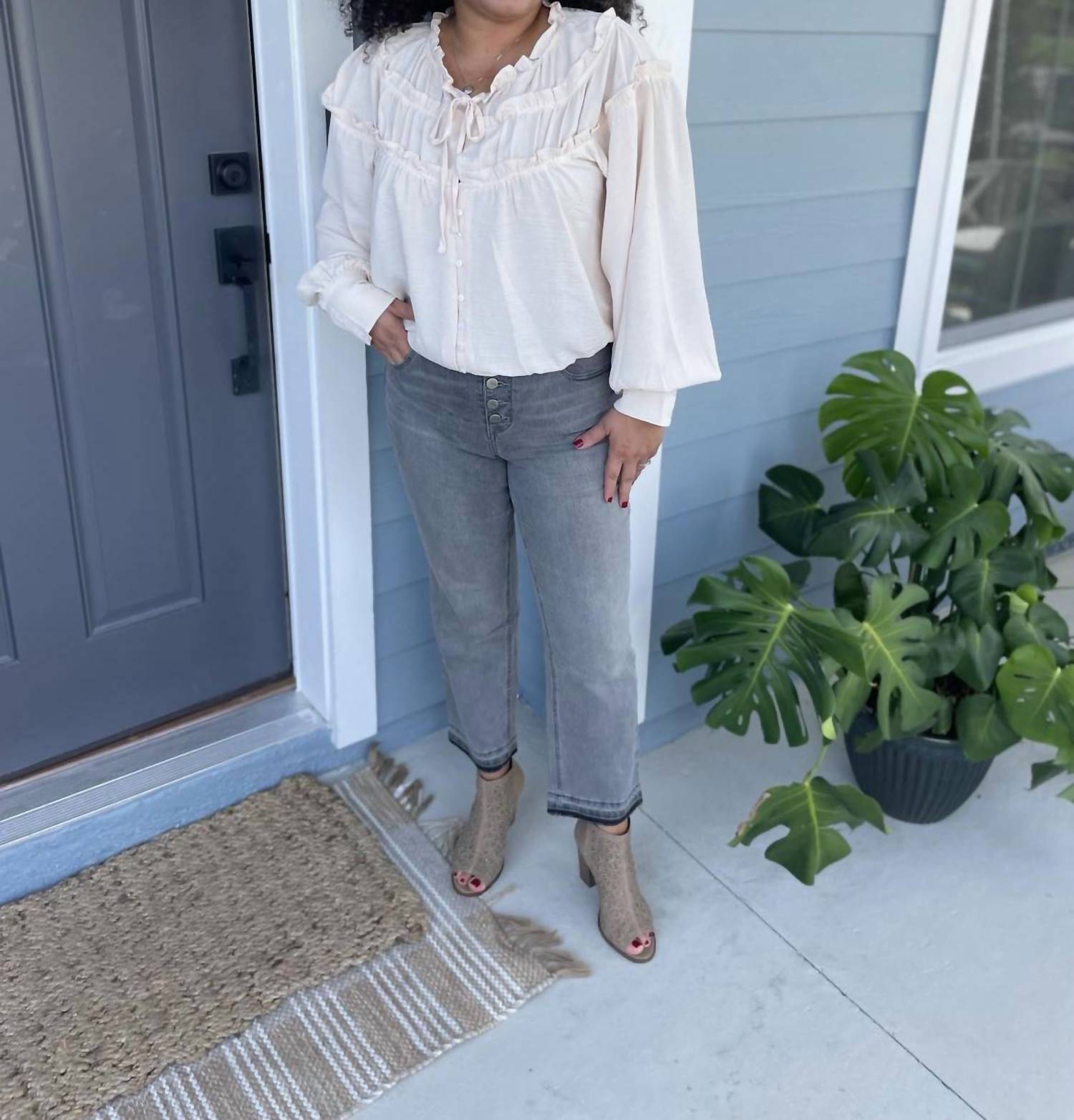 Блузка с V-образным вырезом на завязке и присборенным поясом на резинке. Рукава-фонарики и застежка на пуговицы спереди с тремя ярусами оборок. 100% полиэстер. Размер в размер.