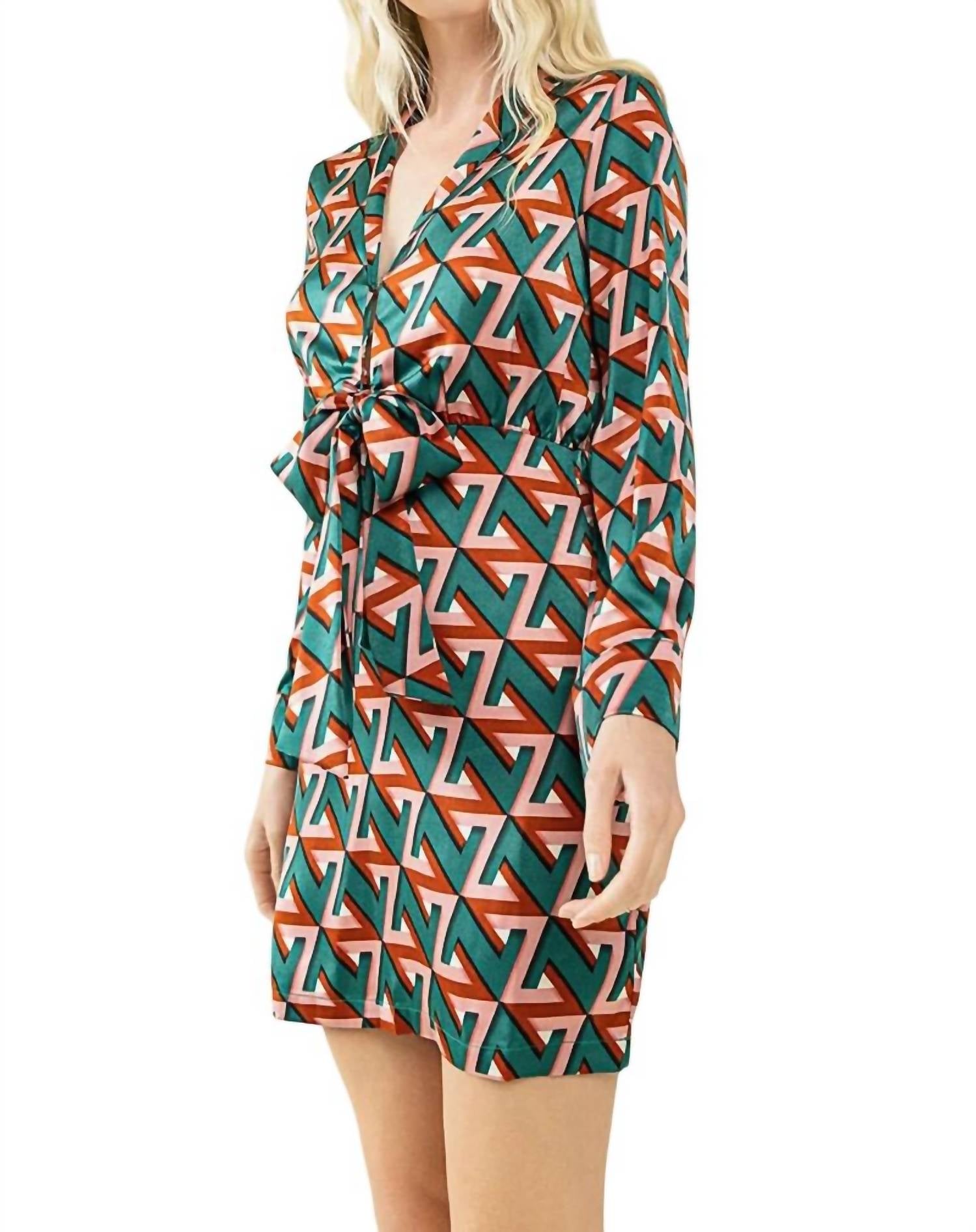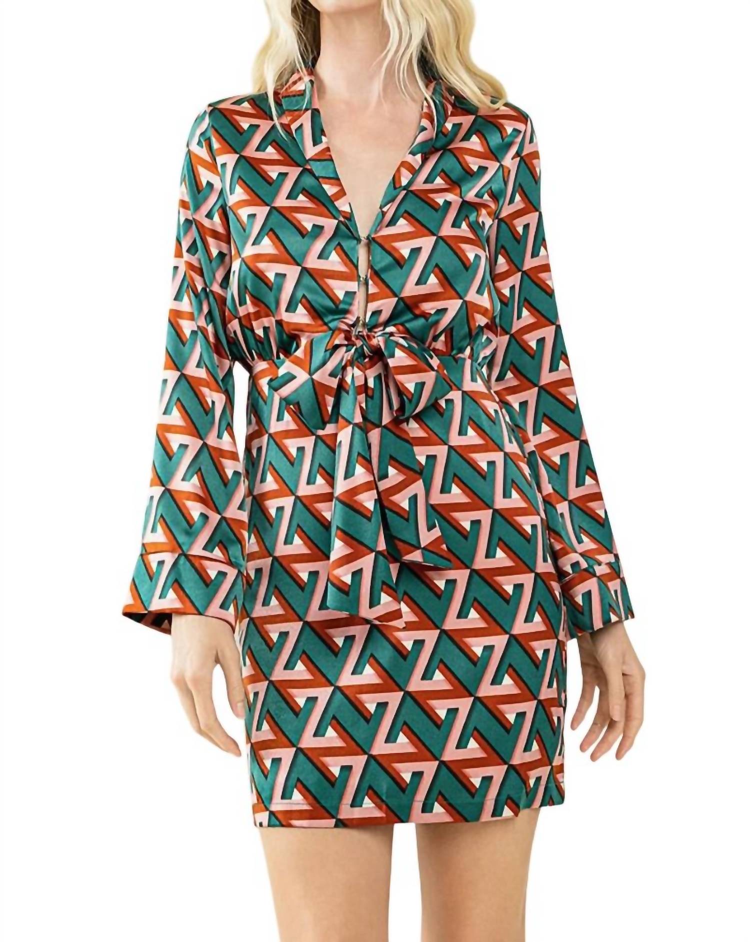 Идеальное мини-платье для теплых месяцев. Откройте для себя современную изысканность в атласном платье Farrah с геометрическим принтом от TCEC. Это мини-платье с длинными рукавами украшено очаровательным разноцветным геометрическим узором в оттенках зеленого, розового и красного. Платье изготовлено из 100% полиэстера, имеет V-образный вырез с воротничком и застежку на крючок. Платье импортируется с рекомендациями по уходу: бережная машинная стирка в холодной воде. Идеально подходит для любого стильного случая.